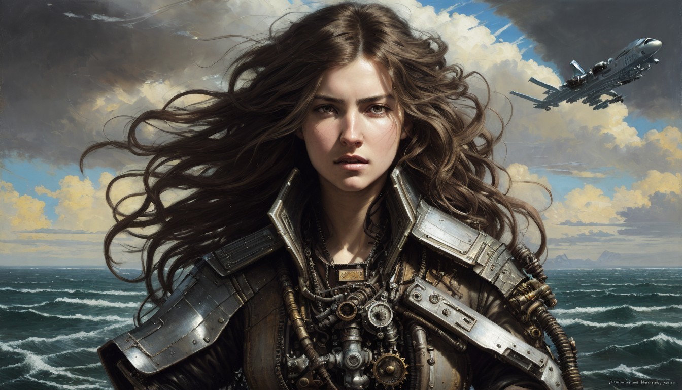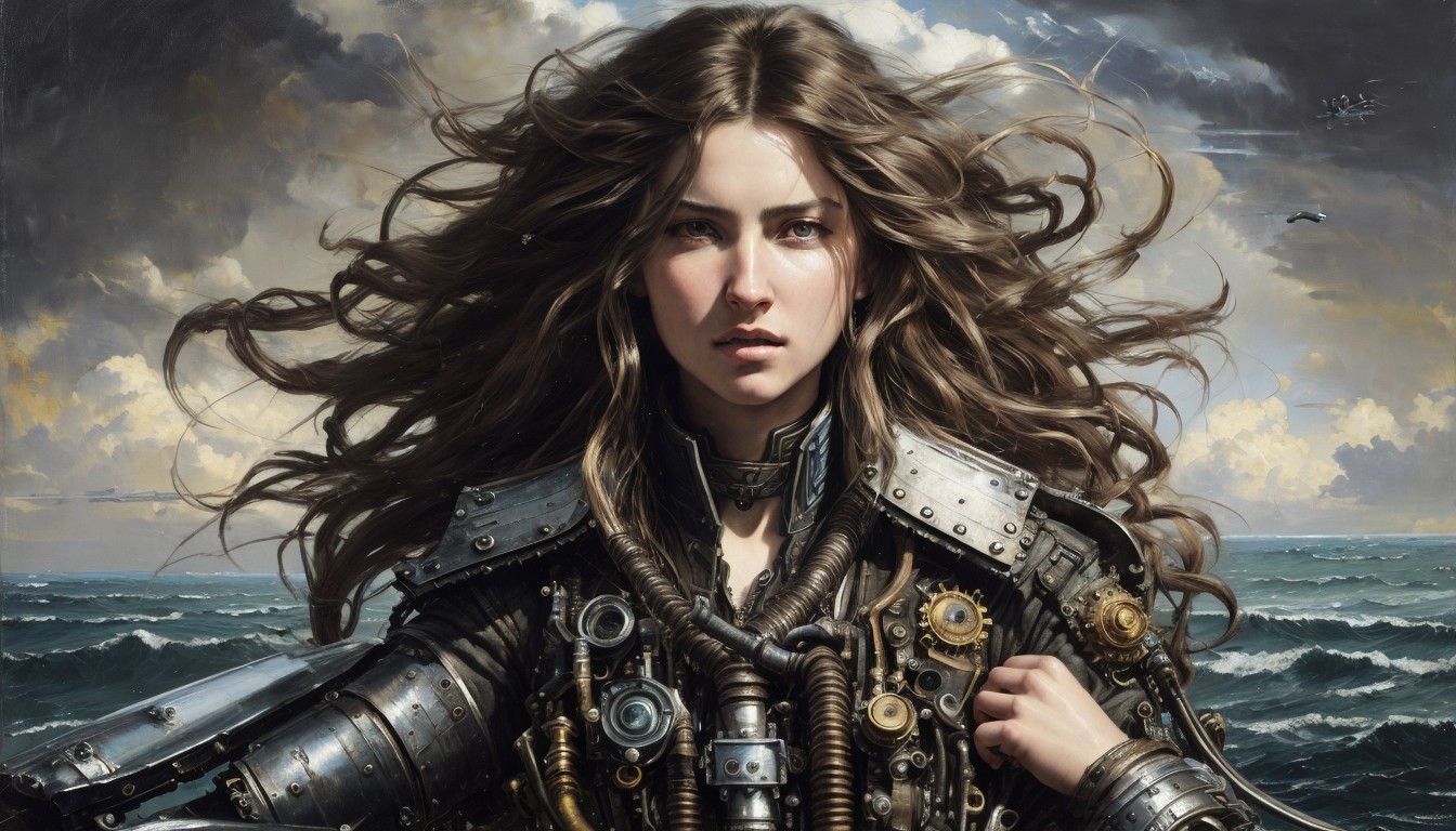 Prompt: "Oppressive oil painting, wavy wild long haired young pilot girl 16 years old and subversive look, badass, controlling a steampunk spaceship, highly detailed illustration by Jeremy Mann, Alex Maleev, Pino Daeni and Liz Gael, masterpiece, 8k resolution, trending on artstation, rough texture, sharp focus, highly detailed intricate, masterpiece, best quality, official art, extremely detailed CG unity 8k wallpaper, highly detailed, absurdres,"