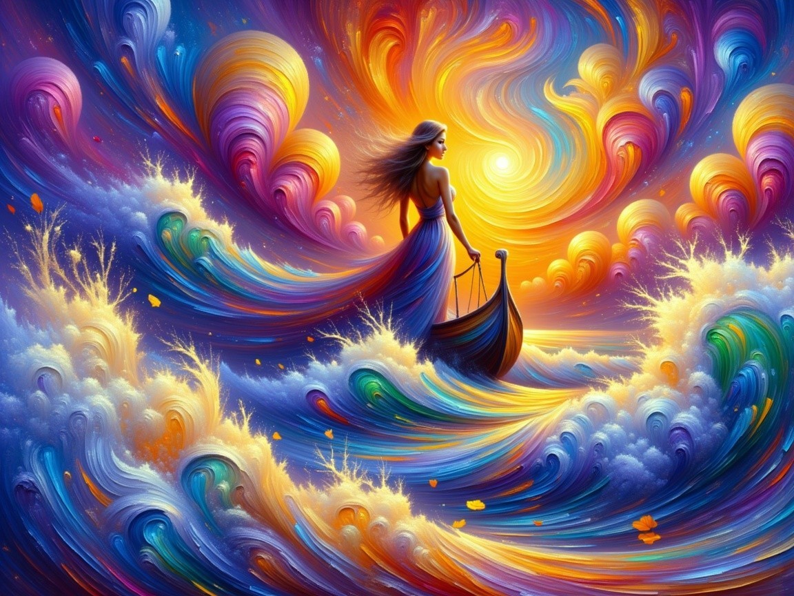 A vibrant scene of a woman in a boat, navigating swirls of colorful waves under a radiant, swirling sunset. The vivid hues create a dreamlike atmosphere, full of movement and emotion.