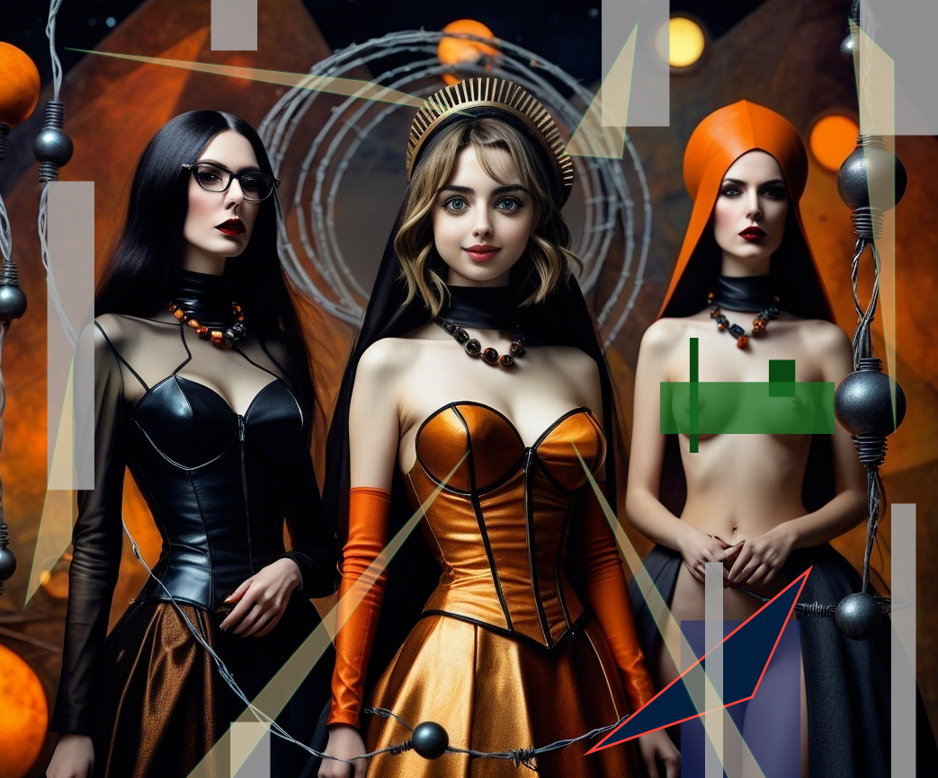 The image features three women with striking features, each adorned in unique, vivid outfits: one in green, another in orange, and a third in black, all exuding an air of mystique and confidence.