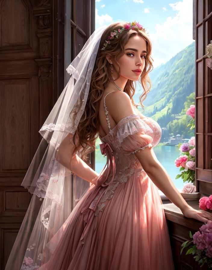 A bride in a pink dress with a floral headpiece stands by a window overlooking mountains, with flowers beside her.