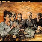 The image depicts a group of five individuals engaged in a serious discussion, surrounded by papers and files. Their expressions suggest intense focus and collaboration on a shared task.