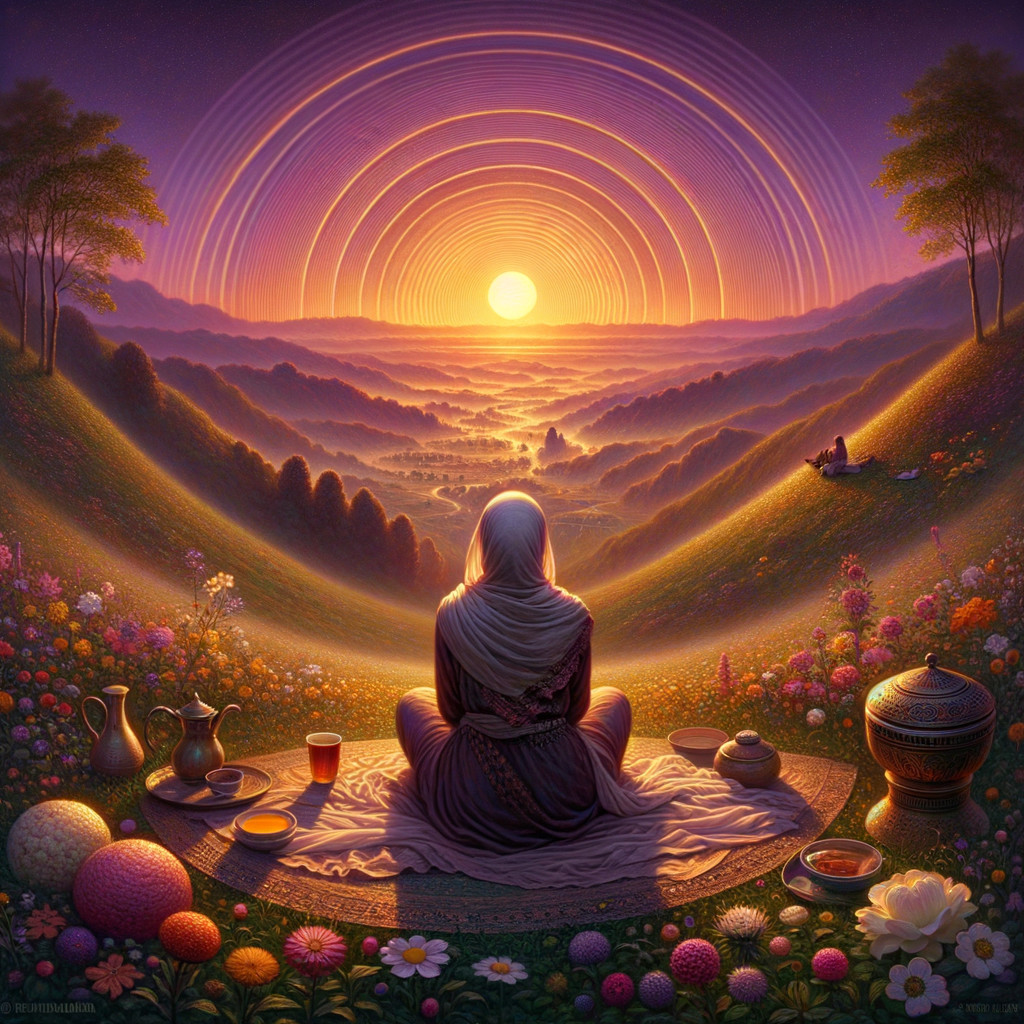 A serene sunset paints the sky in warm hues, as a woman in a flowing dress and headscarf sits amid vibrant flowers, gazing at the tranquil valleys and distant hills.