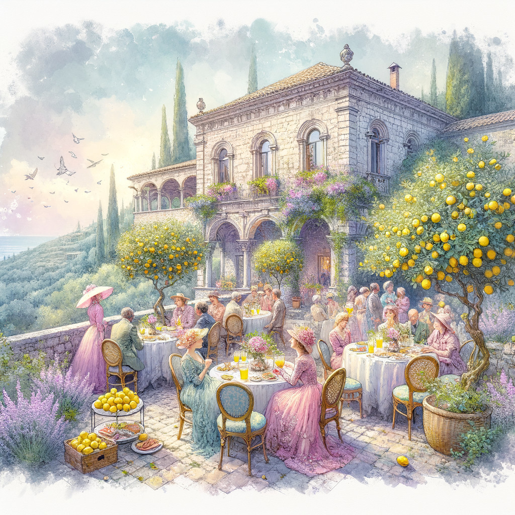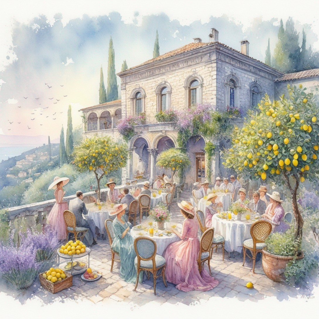 Beautiful old stone building in Italy, beautiful lemon grove below the veranda of the building where people sit at small tables enjoying lemoncello and charcuterie trays. The tables are decorated with miniature lemon trees. Watercolor style of Maurice Utrillo