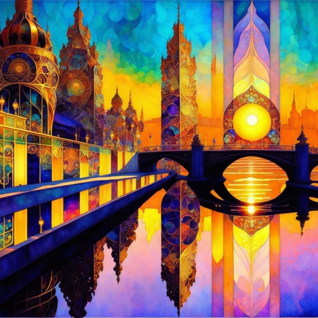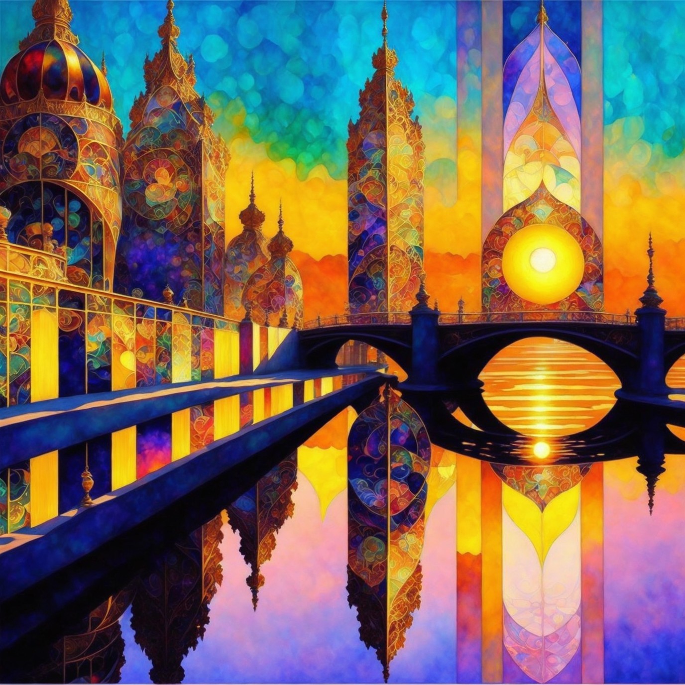 A vibrant, surreal landscape with ornate towers and a bridge, reflecting the golden sun and colorful patterns on serene water, evoking a dreamlike, mystical atmosphere.