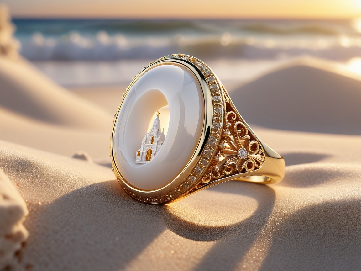 Generate an 8K hyper-realistic image of a close-up up of Beautiful, Golden magic ring with a miniature heavenly WHITE ALABASTER CATHEDRAL, TEMPLE within the jewel. The ring lies on a sandy beach during a breathtaking sunset. Exuding a dreamlike charm with a fantastic white alabaster cathedral spread out within the enchanting depths of the gemstones. Intricate details on the ring and a miniature heavenly landscape within the jewel. The waves gently lap at the shore, reflecting hues of pink, orange, and purple from the sky. A stunning ring adorned with exquisite gemstones, bathed in a soft glow, with a palette of Moonstone blue, Opal silver, and delicate, shimmering pale pink tones that give off a subtle shimmer. Golden metallic palette (((surreal Fantasy Glass crystal))) interwoven twist and swirls and ornaments, crystal buds, high lights and glowing details of natural life. The atmosphere is a mix of tranquility and beauty. Careful drawing of details, clear contours, photorealism, botanical art, curls, beautiful, realistic, high resolution, high details. Background is A stunningly beautiful (((beach))) with palm trees swaying in the gentle breeze, their leaves rustling out from the warm, inviting sunbeams. The water is as crystal-clear as it could be, reflecting the brilliant blues and whites of the sky above. The sand is soft underfoot, covered with a light sprinkling of (shimmering) white shells that make a great contrast against the deep blue of the ocean. The air is (softly) infused with (vividly) colored flowers that emit a (sweetly) floral aroma, giving off a sense of pure joy and serenity. The scene is painted with intricate details, using a (soft, oil painting) technique that brings the image to life, embodying the essence of a (beautiful beach) with its (clear waters and vibrant flora and fauna) on the sand.