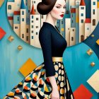 A stylish woman in a vibrant, geometric-patterned dress stands against a colorful patchwork background. Her elegant look is complemented by a blue hair accessory and classic high heels.