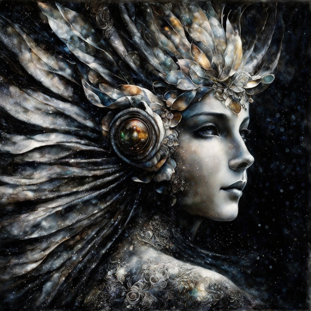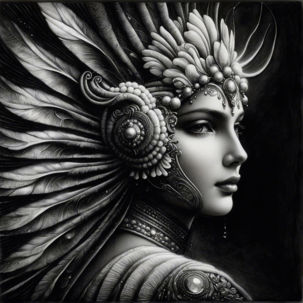 A captivating portrait of a woman adorned with a crown of delicate feathers and jewels, set against a dark background. Her serene expression exudes grace and mystery, enhanced by intricate details.