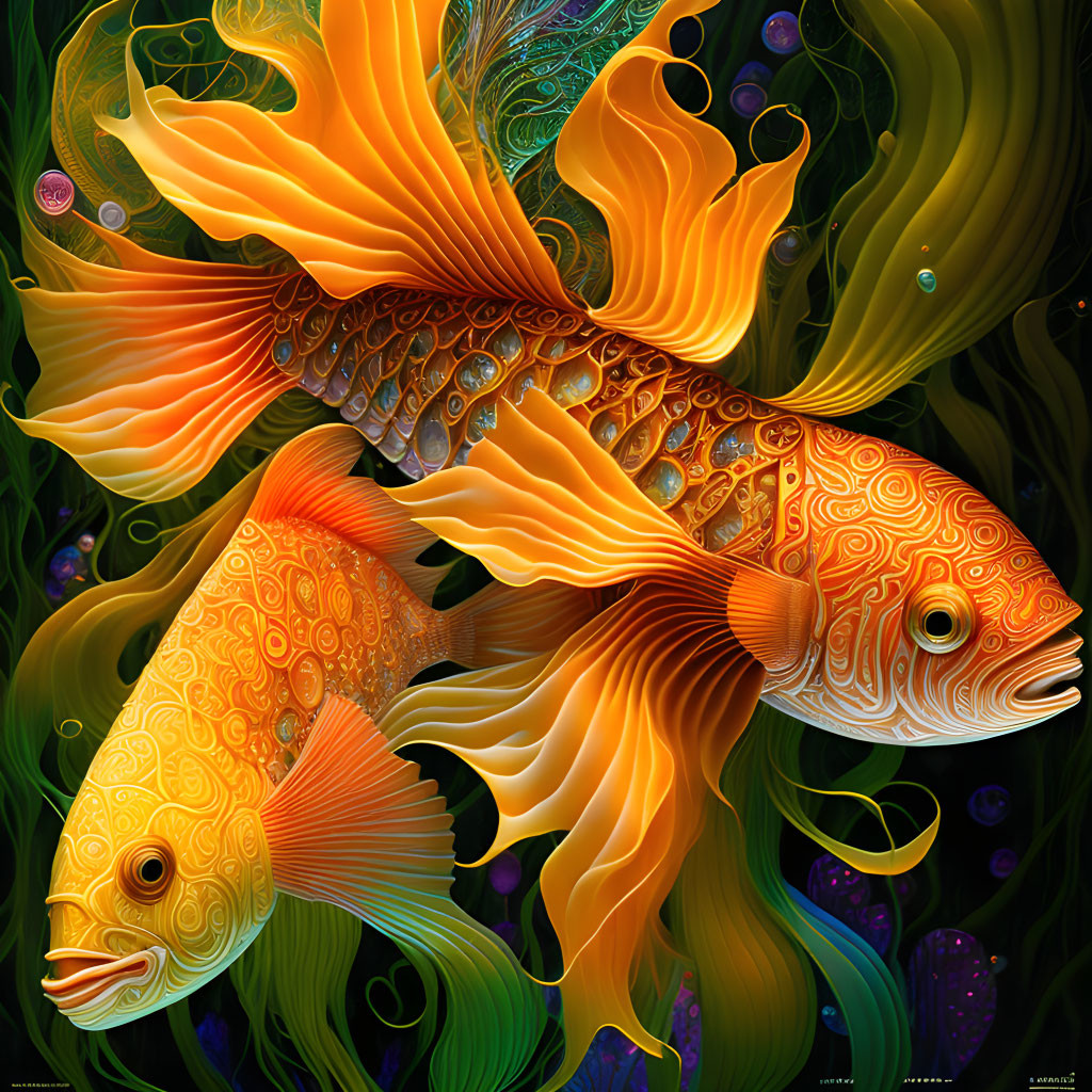 Colorful Stylized Goldfish Swimming in Patterned Aquatic Foliage