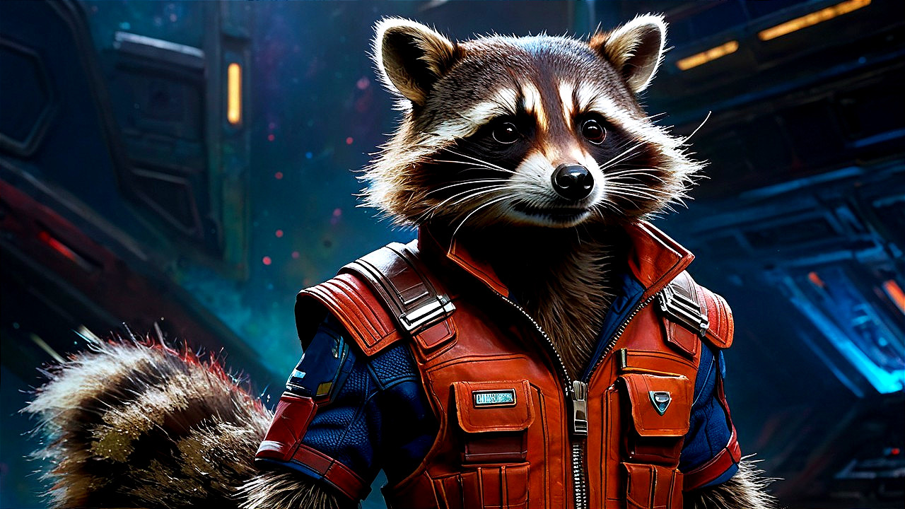 A stylized raccoon in a vibrant space suit, featuring a red vest with futuristic details. The background suggests an intergalactic setting, filled with colorful cosmic elements.