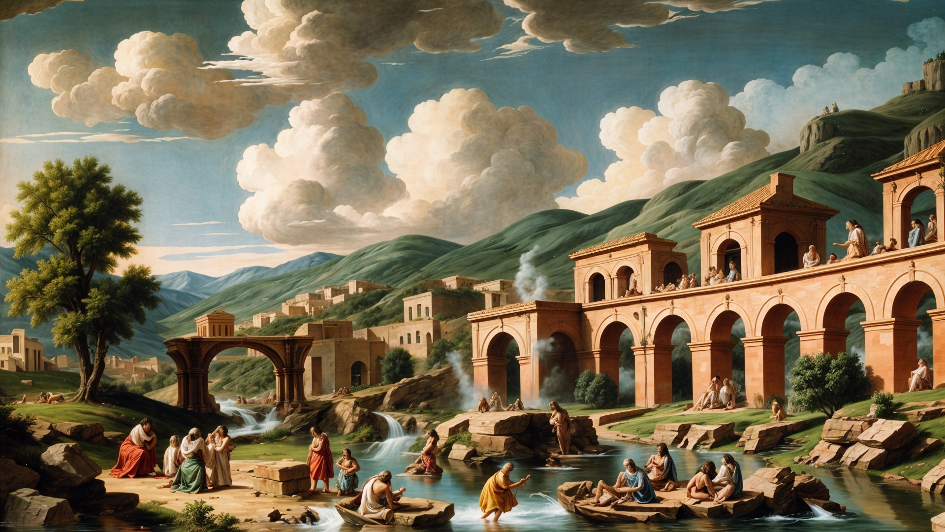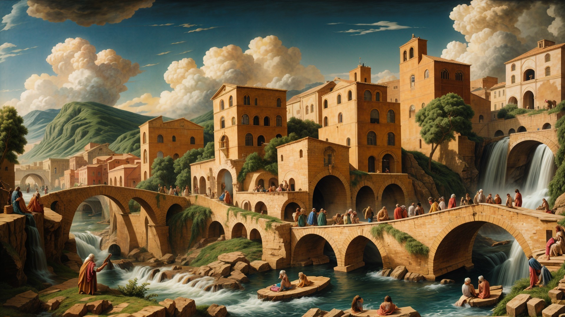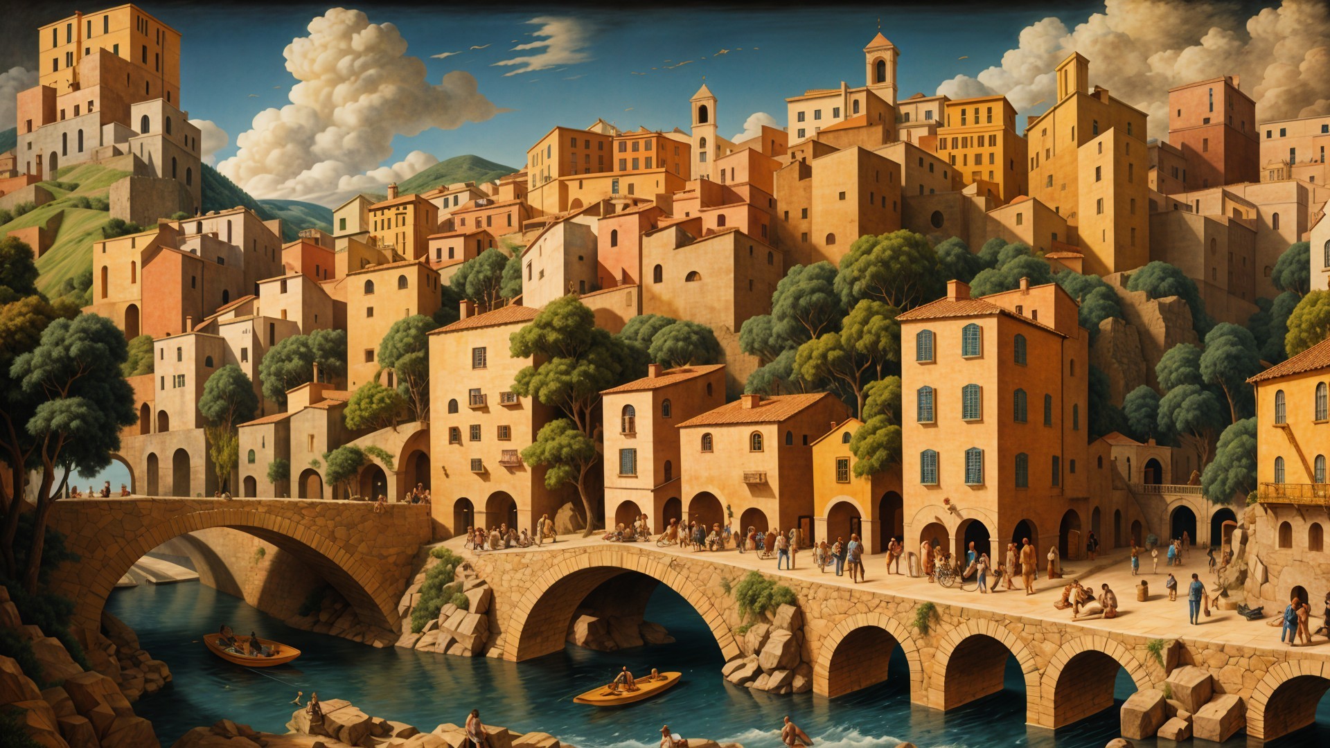 The image depicts a picturesque village by a river, featuring colorful buildings, arched bridges, lush trees, and boats on the water, set against rolling hills and a dramatic sky.