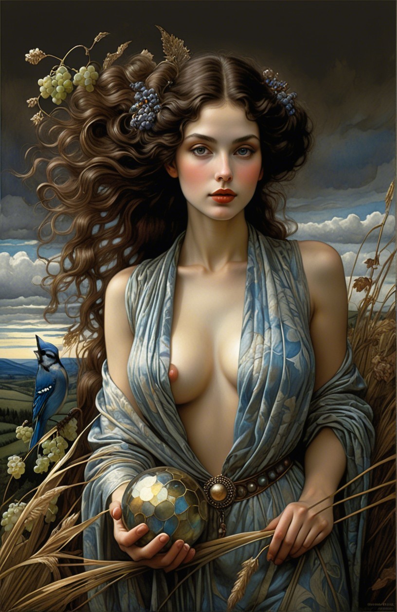 A serene woman in flowing, blue fabric holds an ornate globe and stands amidst nature. Gentle birds accompany her, set against a dramatic sky, evoking a sense of harmony and mystique.