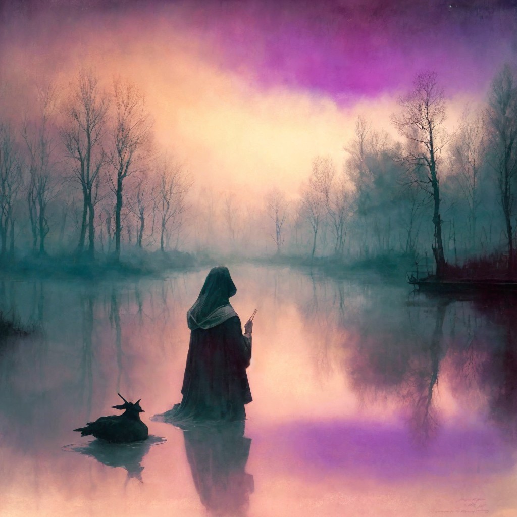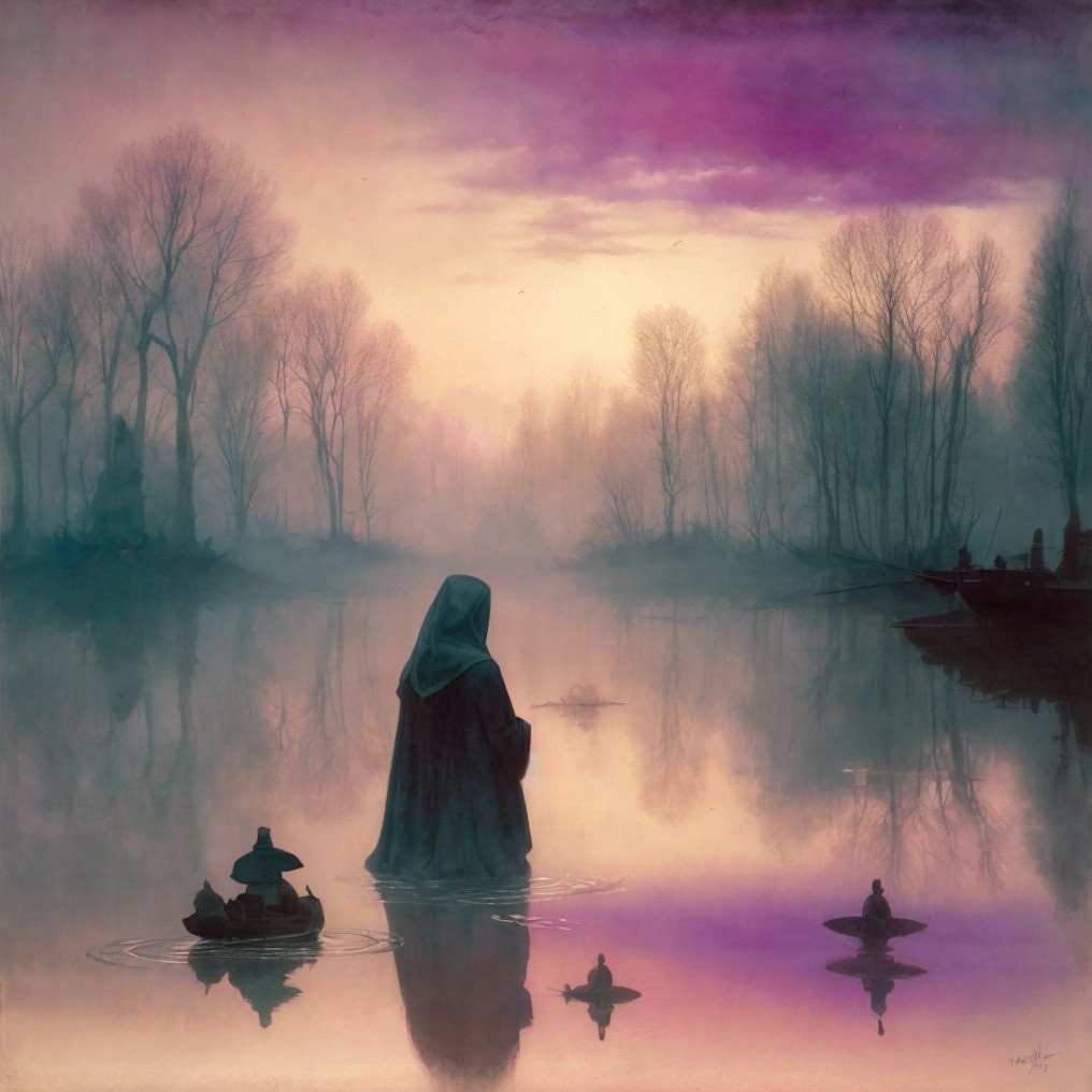 A serene misty landscape features towering spires and trees reflected in calm waters. A cloaked figure stands by the shore, while a small boat drifts peacefully in the distance.