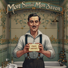 A retro-styled illustration shows a man in a vintage bathroom holding a bar of soap labeled "mon savon." The decorative tiles and elegant fixtures enhance the classic atmosphere.