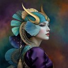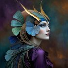 The image depicts a graceful figure with long, flowing hair adorned with a vibrant blue butterfly. She wears an elegant headdress and richly colored fabrics, evoking a mystical, enchanting aura.