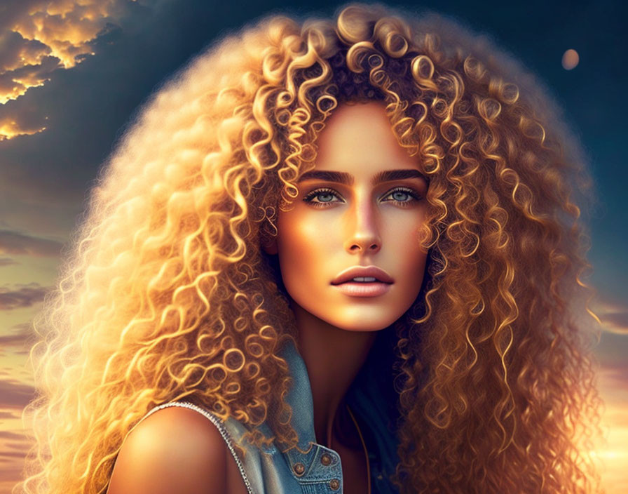 Blonde woman with curly hair and blue eyes in fantasy portrait