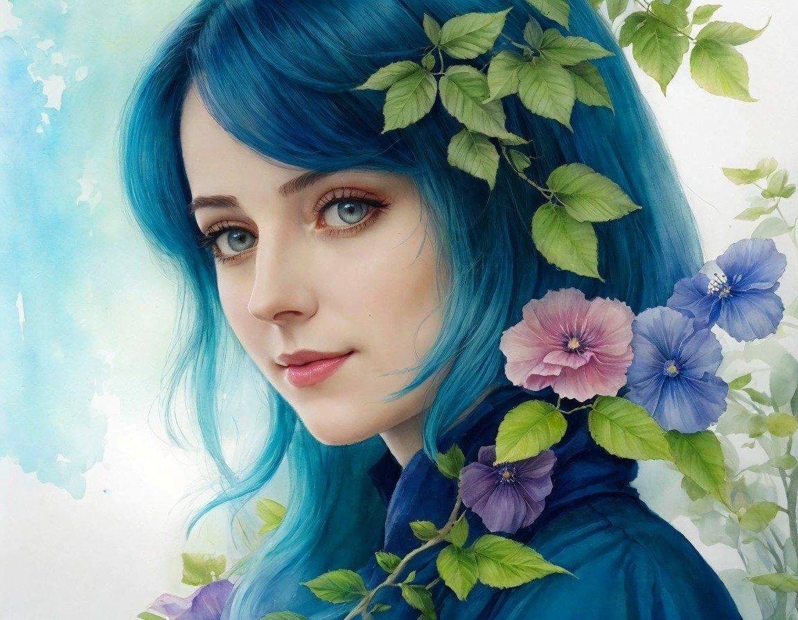 A painting of a woman with blue hair and flowers intertwined. She has striking blue eyes and a serene expression.
