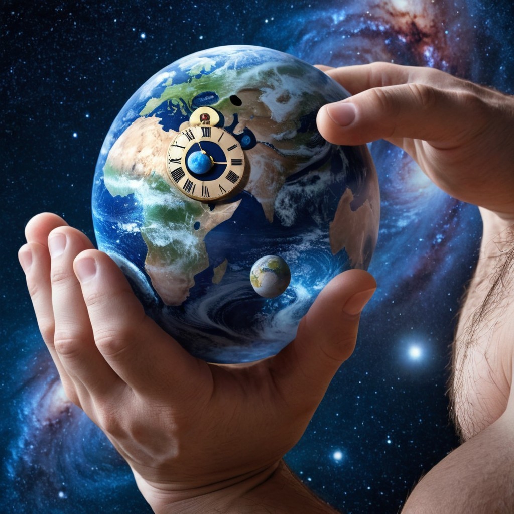 A pair of hands gently holds a vibrant Earth, set against a backdrop of stars and cosmic swirls, symbolizing protection and the beauty of our planet in the universe.