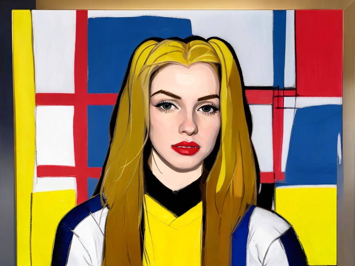 A portrait of a young woman in football clothing, with long blonde hair and bold red lips, in front of a vibrant abstract background of geometric shapes in primary colors.