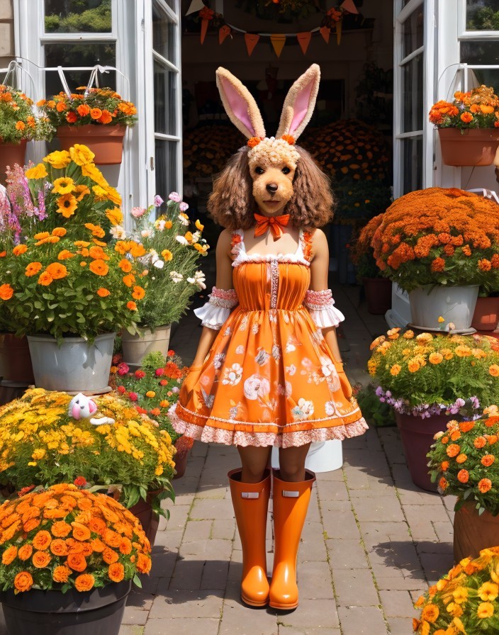 Prompt: "Anthropomorphic, humanoid: easter bunny big brown humanoid Poodle, wearing an orange gardener's dress, orange gardener's clothes, orange rubber boots on feet, wearing gloves, autumn feeling, autumn sunlight, standing in a beautiful huge flower shop, yellow flowers, red flowers, pink flower, plants, (anthropomorphic), humanlike, anthropoid, anthropomorph, chimera, full body, head to toe, (no human face)"