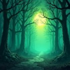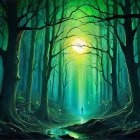 A mystical forest scene filled with tall, dark trees and a glowing, almost ethereal green light. A serene waterway reflects the light, enhancing the enchanted atmosphere.