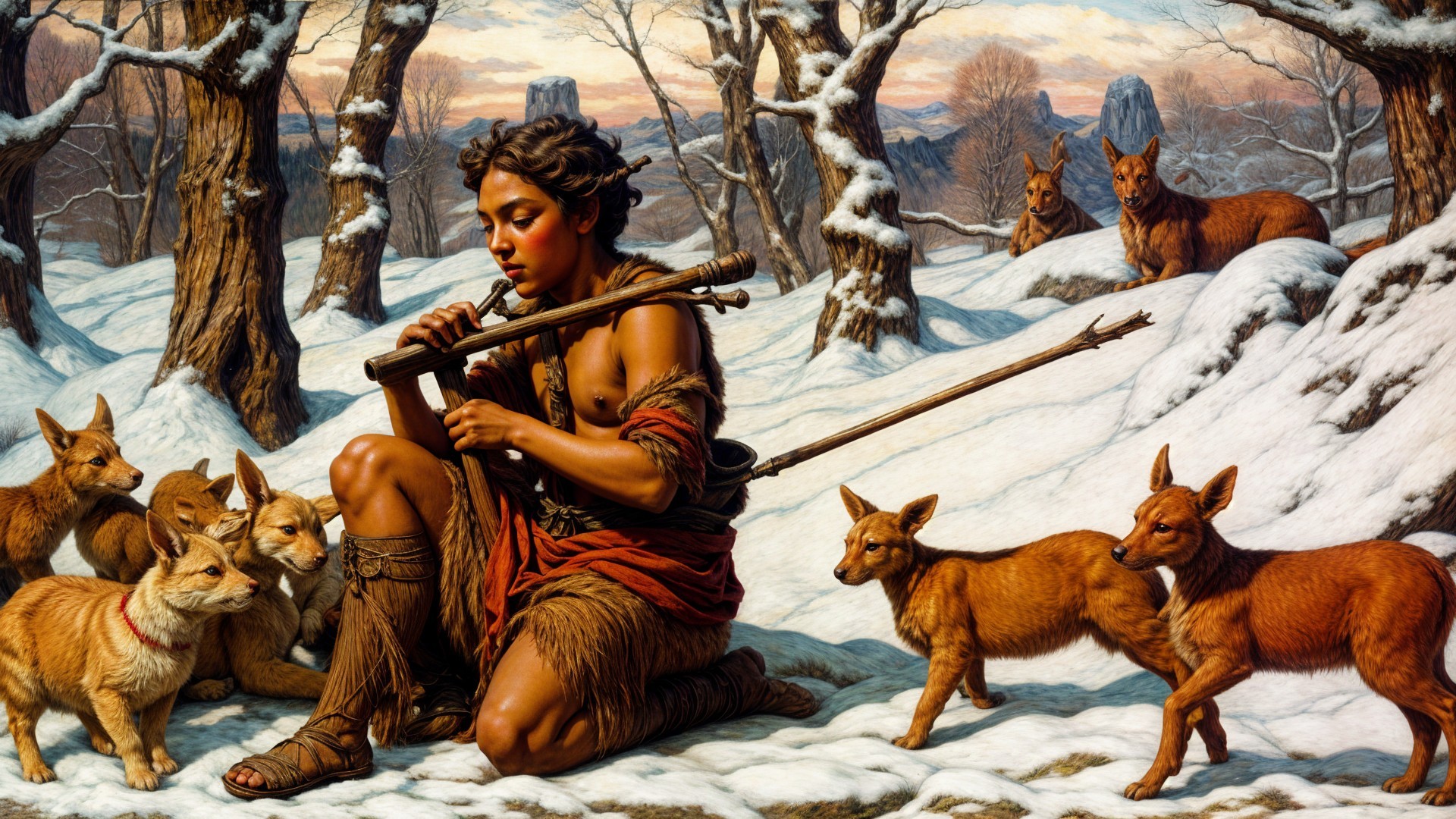 A young boy in a furry coat sits in the snow, playing a flute. Around him are four playful fox pups, set against a serene winter landscape with distant mountains.