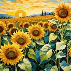 A vibrant landscape featuring a field of sunflowers basking in the golden glow of a sunrise, with rolling hills and trees silhouetted against a colorful sky filled with clouds.