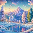 A serene winter landscape features snow-covered trees and a cozy cabin by a shimmering river, with a colorful sky at dawn casting a magical glow over the tranquil scene.