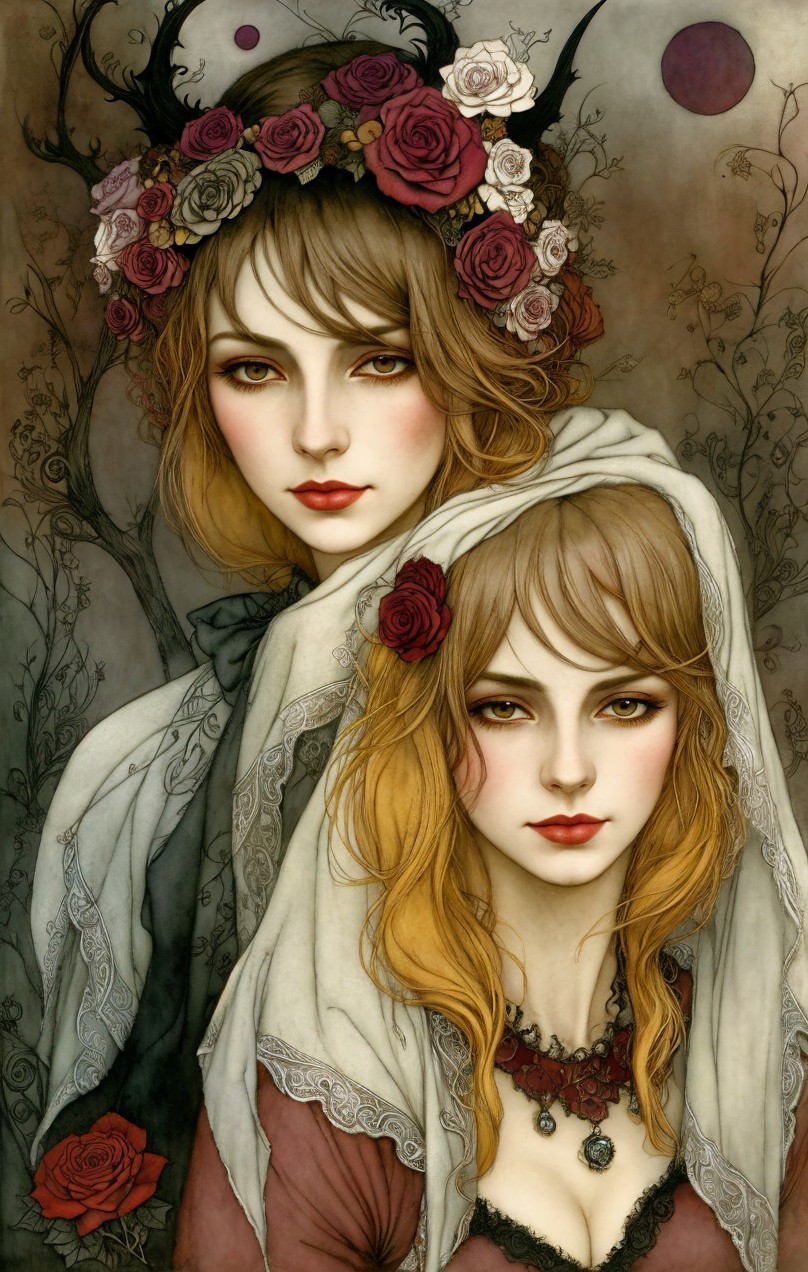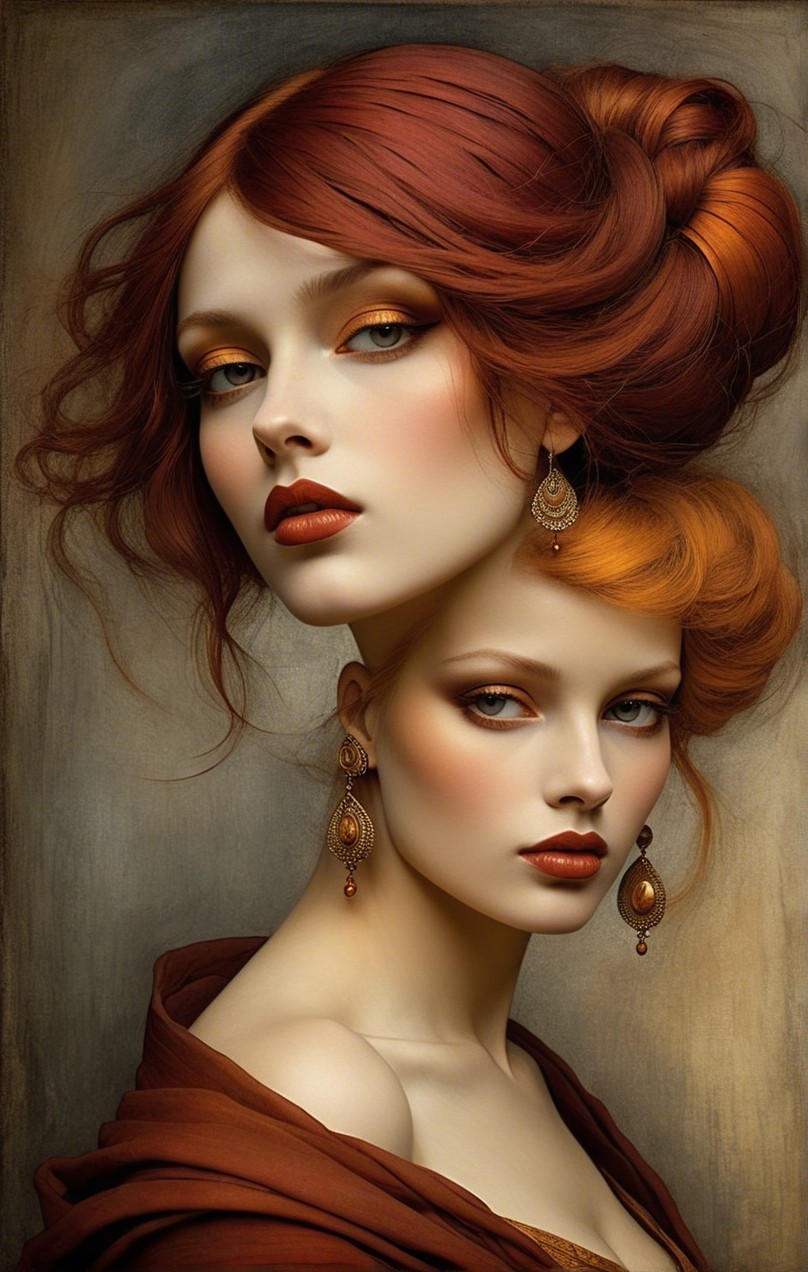 A striking portrait of a woman with long, flowing red hair and a deep auburn gown. Her piercing eyes and elegant pose exude a sense of grace and mystery against a muted background.