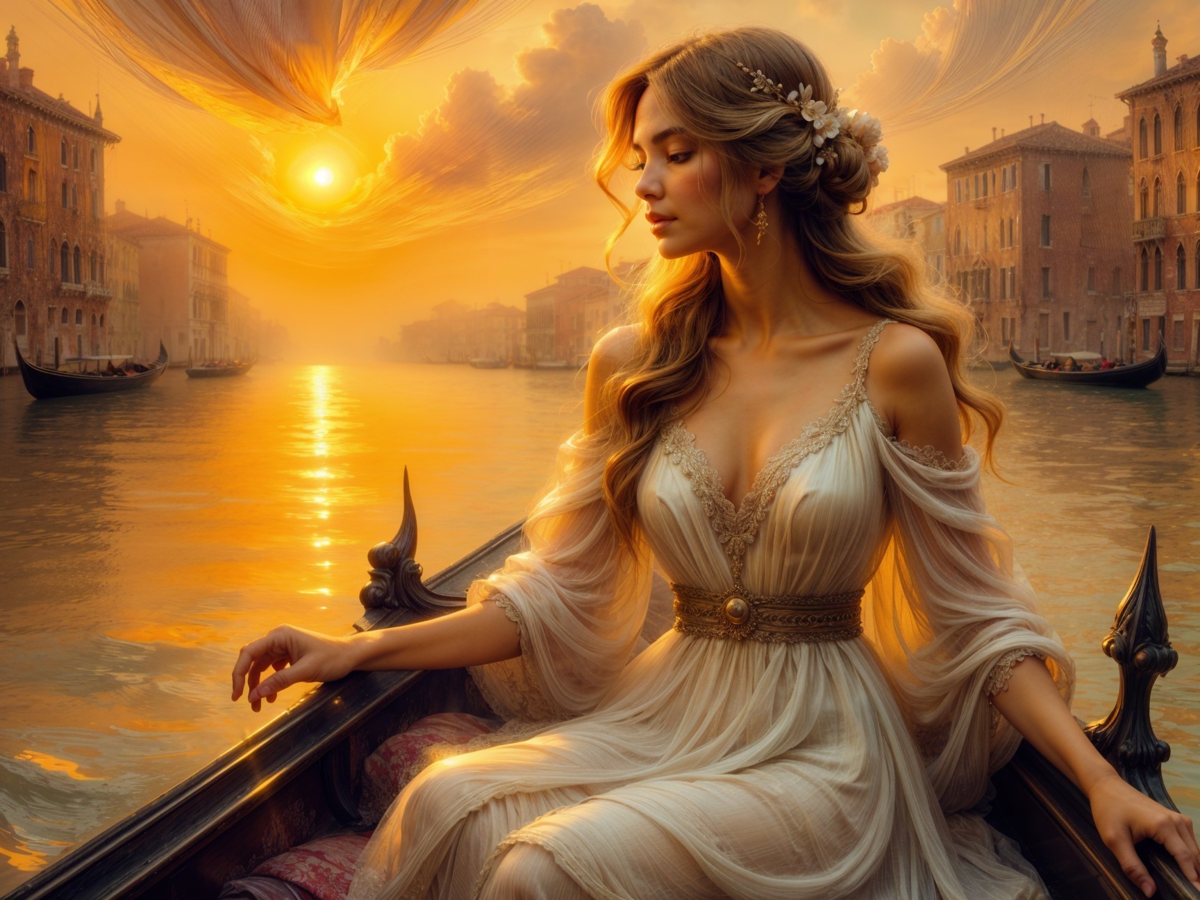 A serene sunset illuminates a canal lined with colorful buildings. A woman in an elegant satin gown and floral headpiece gazes thoughtfully, embodying a dreamy, picturesque moment.