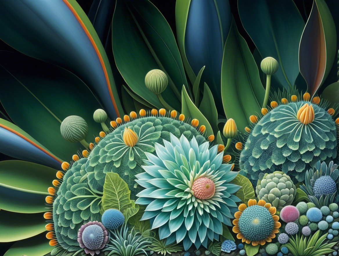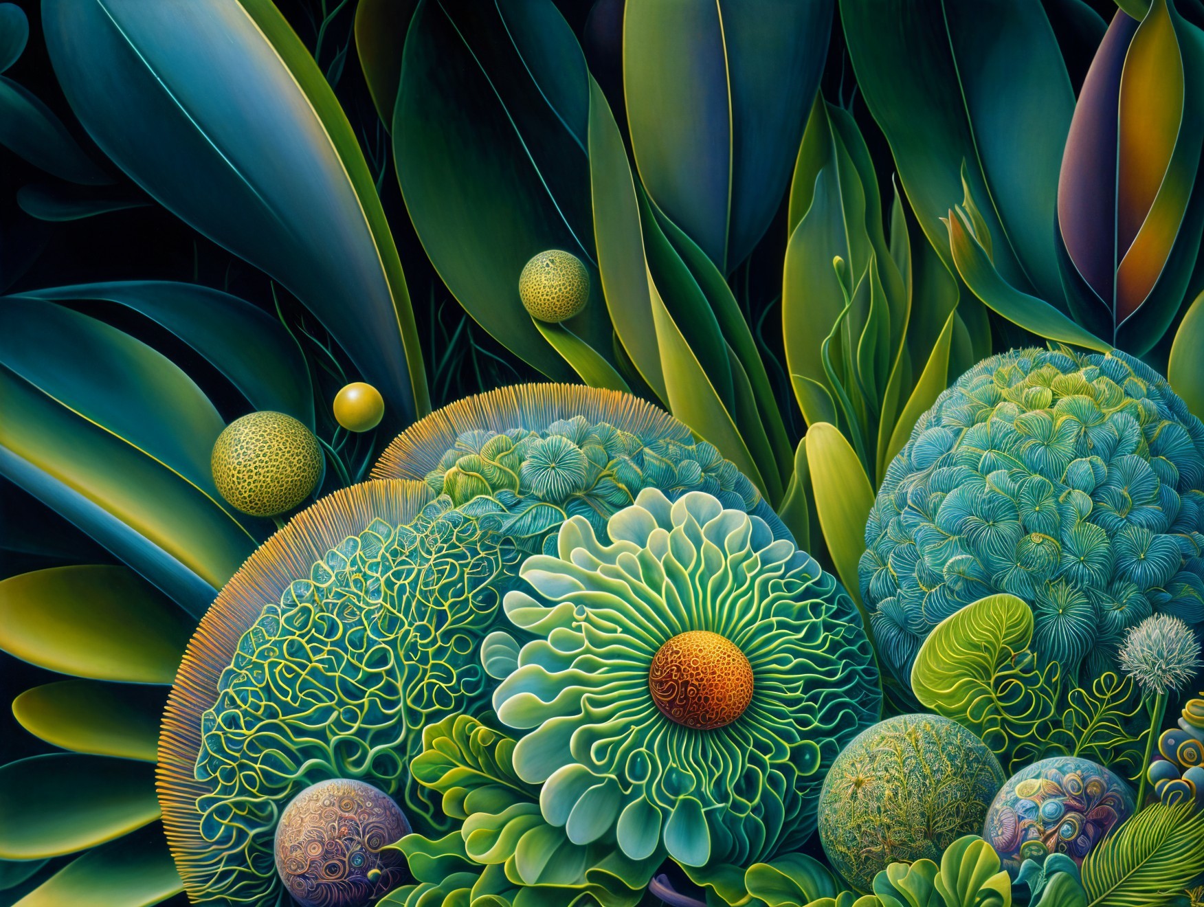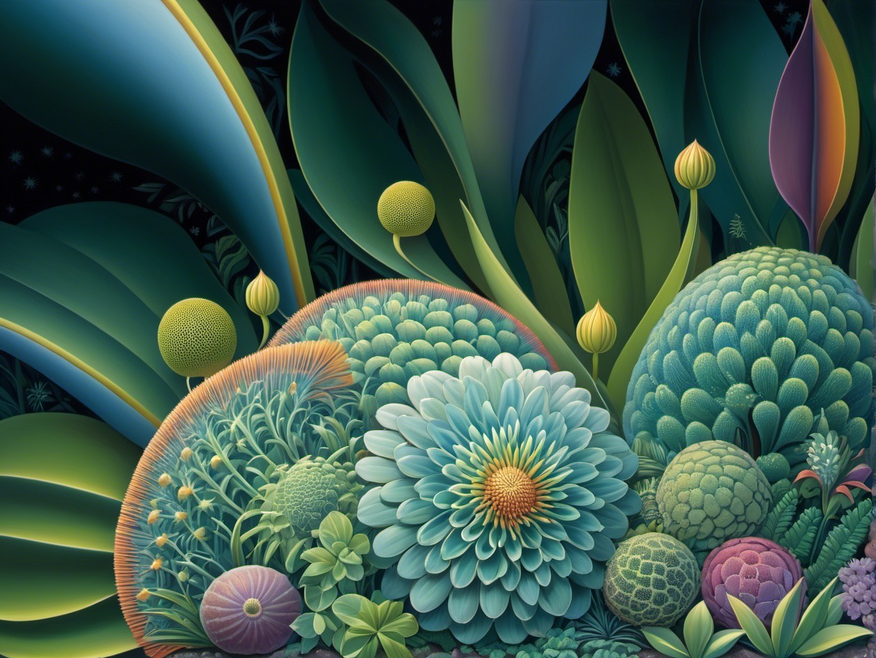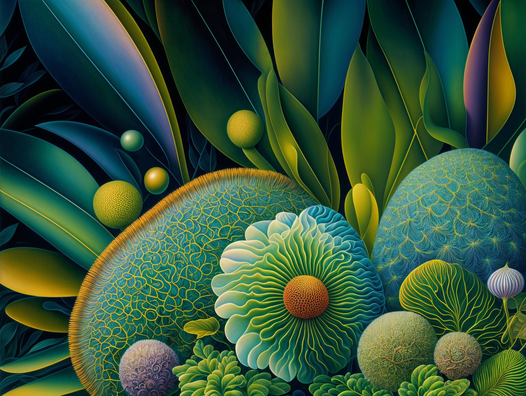 A vibrant, surreal arrangement of lush green foliage, exotic spheres, and intricate floral designs, creating an enchanting tropical garden atmosphere with rich colors and textures.