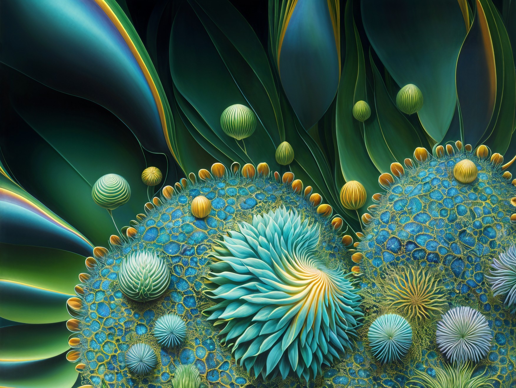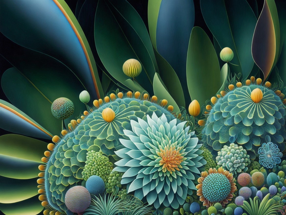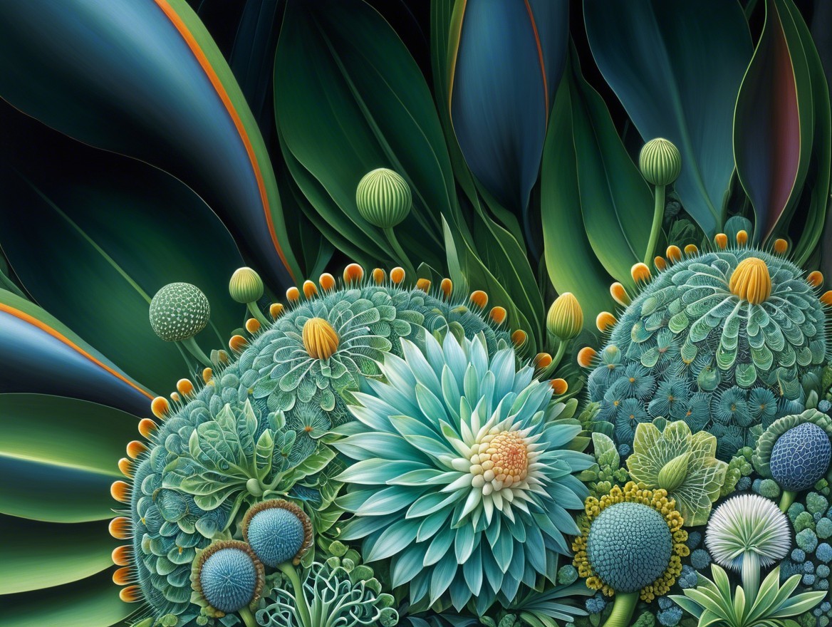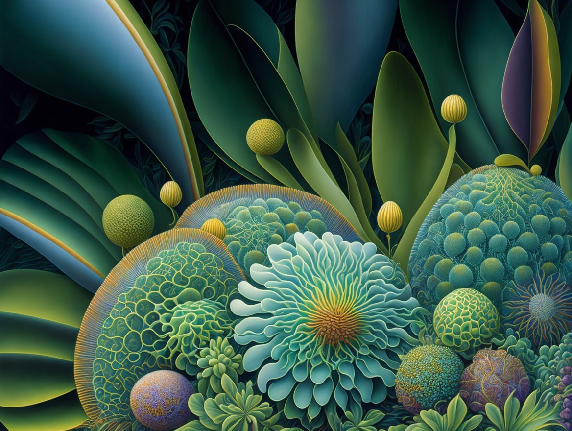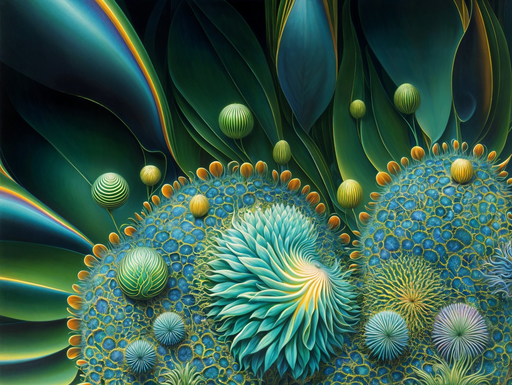 A vibrant, surreal arrangement of lush green foliage, exotic spheres, and intricate floral designs, creating an enchanting tropical garden atmosphere with rich colors and textures.