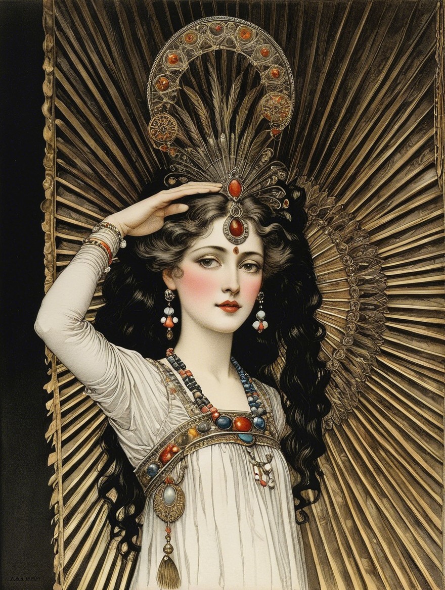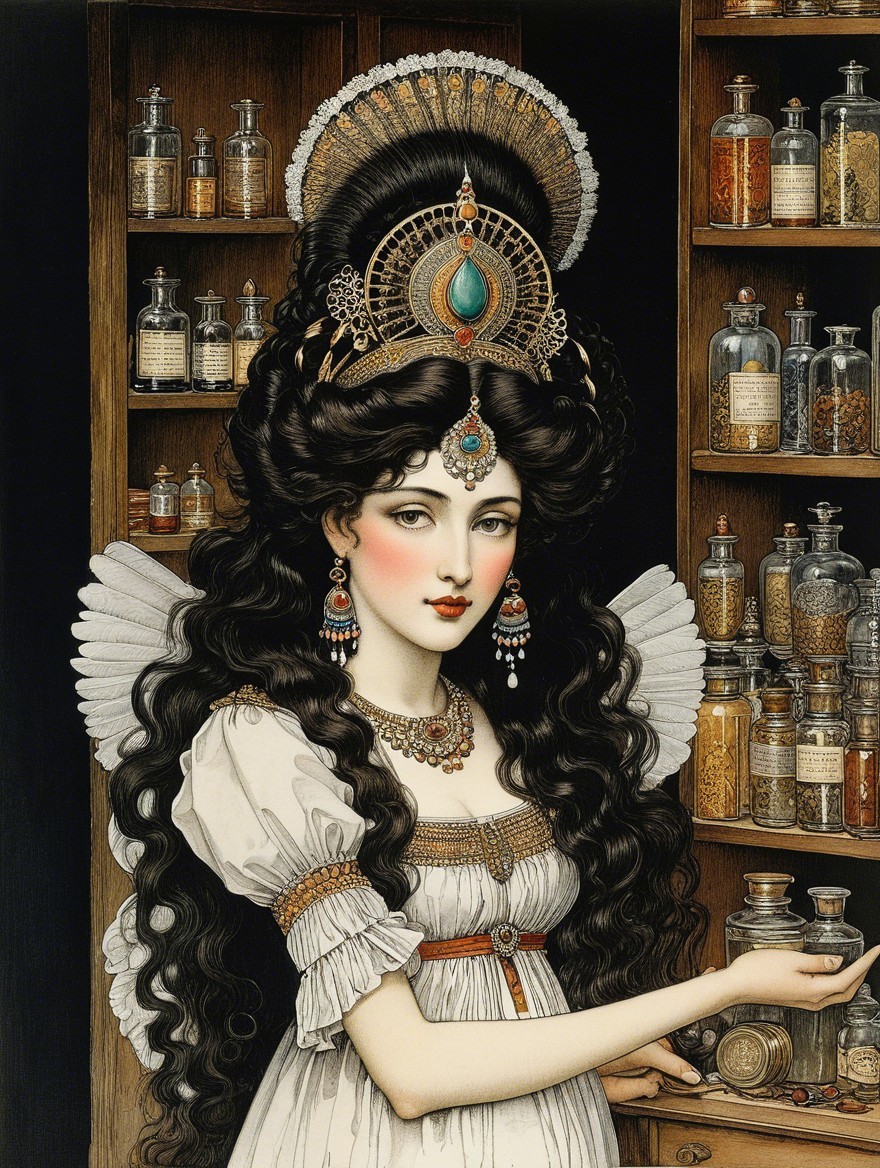 A woman in a vintage dress adorned with flowers stands in a well-stocked apothecary. She examines a book while surrounded by glass bottles, showcasing a blend of beauty and curiosity.