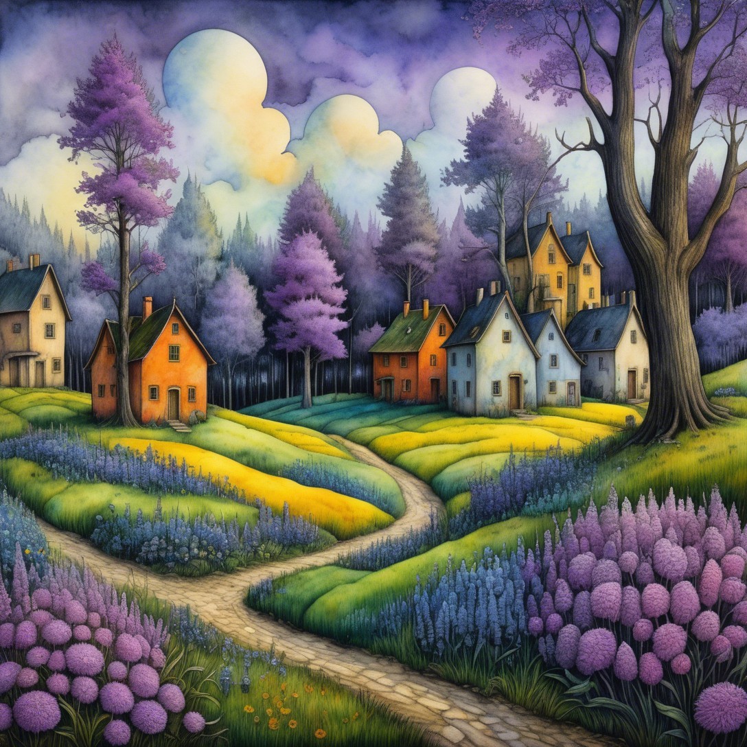 A whimsical, colorful illustration of a fantasy village with unique houses, purple trees, and twin moons in the night sky.