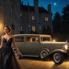 A woman in an elegant black gown stands confidently beside a vintage car, set against a grand mansion illuminated by evening lights. The scene exudes sophistication and timeless glamour.