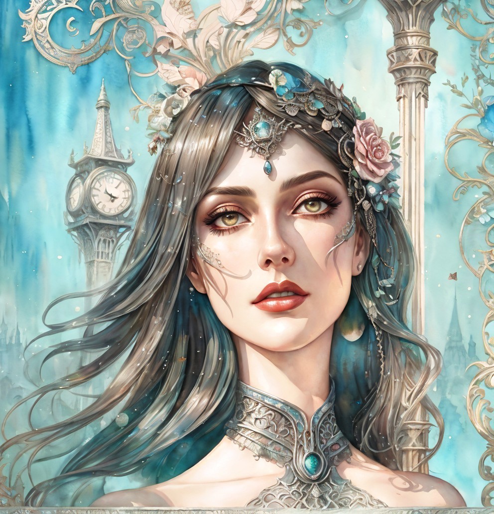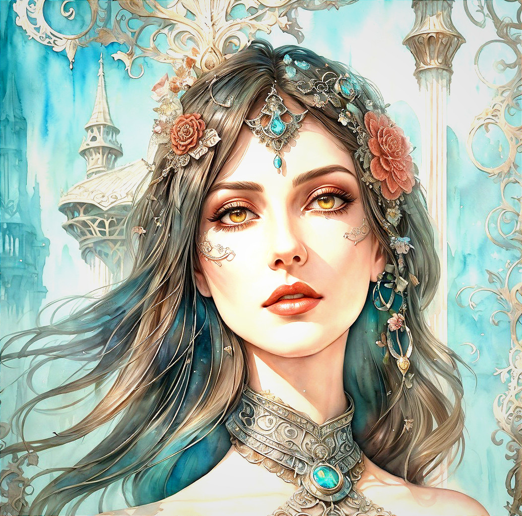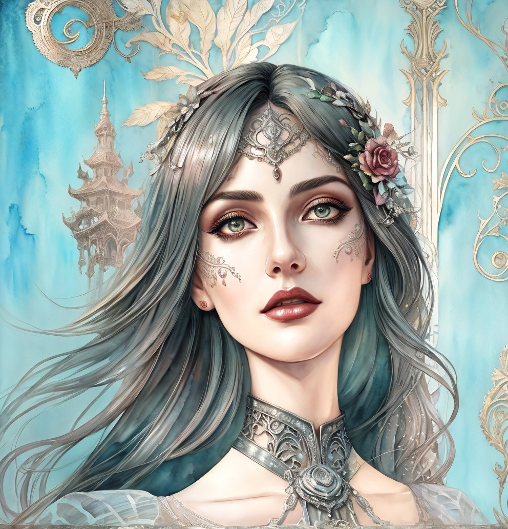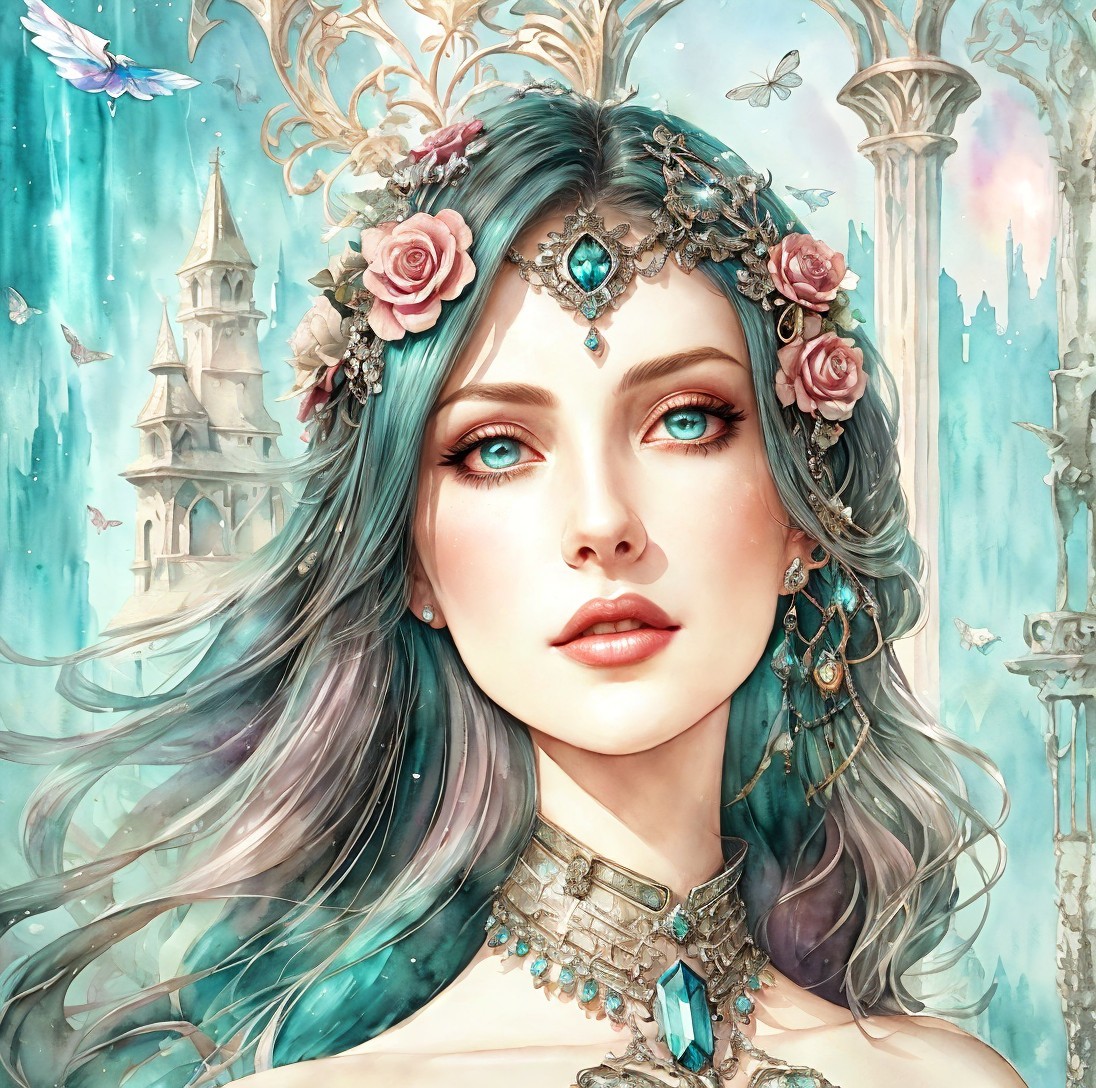 storybook illustration portraiture, Temptress portrayed in watercolor and ink, gazing upwards with a sense of serenity and optimism. background with stylized medieval details, illustration on wavery teal background, (Traumacore 1.9, Detailed corrosion, (high-contrast features: pretty pale skin), crystalline hair, striking bioluminescent eyes, 8:5), bold auburn lips, splashing ink-like drips originating from her hair, sharp. streaks of red and green flowing downward, custom_loss:black, embossed strokes, triadic color scheme teal beige black, Figurative, synthetic, traumacore 1.9, beautiful composition 1.9, splash art style merged with marvel comic book art style, stylized line-art, layered, geometrical illustration, hues, custom_loss: black, encaustic streaks in stylized depiction, fine strokes, serene, beautiful composition 1.9, coffinwood 1.7, soft rounded edges, dethereal, anisotropic filtering 1.7, raytraced shadows 1.8, high coloring, abstract brushstroke art, vector 9:5, elegant, Dark Fantasy, mythical,veerie, uncanny, sinister, grain, patina with topographic filigree lines, modernist fashion photography, detailed ornamental features, baroque fantasy style painting, gouache paint 1.8, Stylized Portraiture in style of edward Hopper and Dejah Thoris and Georges Braque, fauvistic cuts, stylized, quilling, glossy, Plushy cuts, sublime, eldritch, dark rim lighting from top to centre, stylized lineage illustration, delicate coloring, simplistic hairstyle in stacked lines, glossy, erotic, close-up portrait, wavy --ar 4:5 --style raw, rough gritty texture, modern, charcoal sketch textures and squiggly lines, fiery.colored, ghostly, mysterious, supernatural, dark aesthetic, moody atmosphere, gloomy, mysterious aura, soft rounded edges,