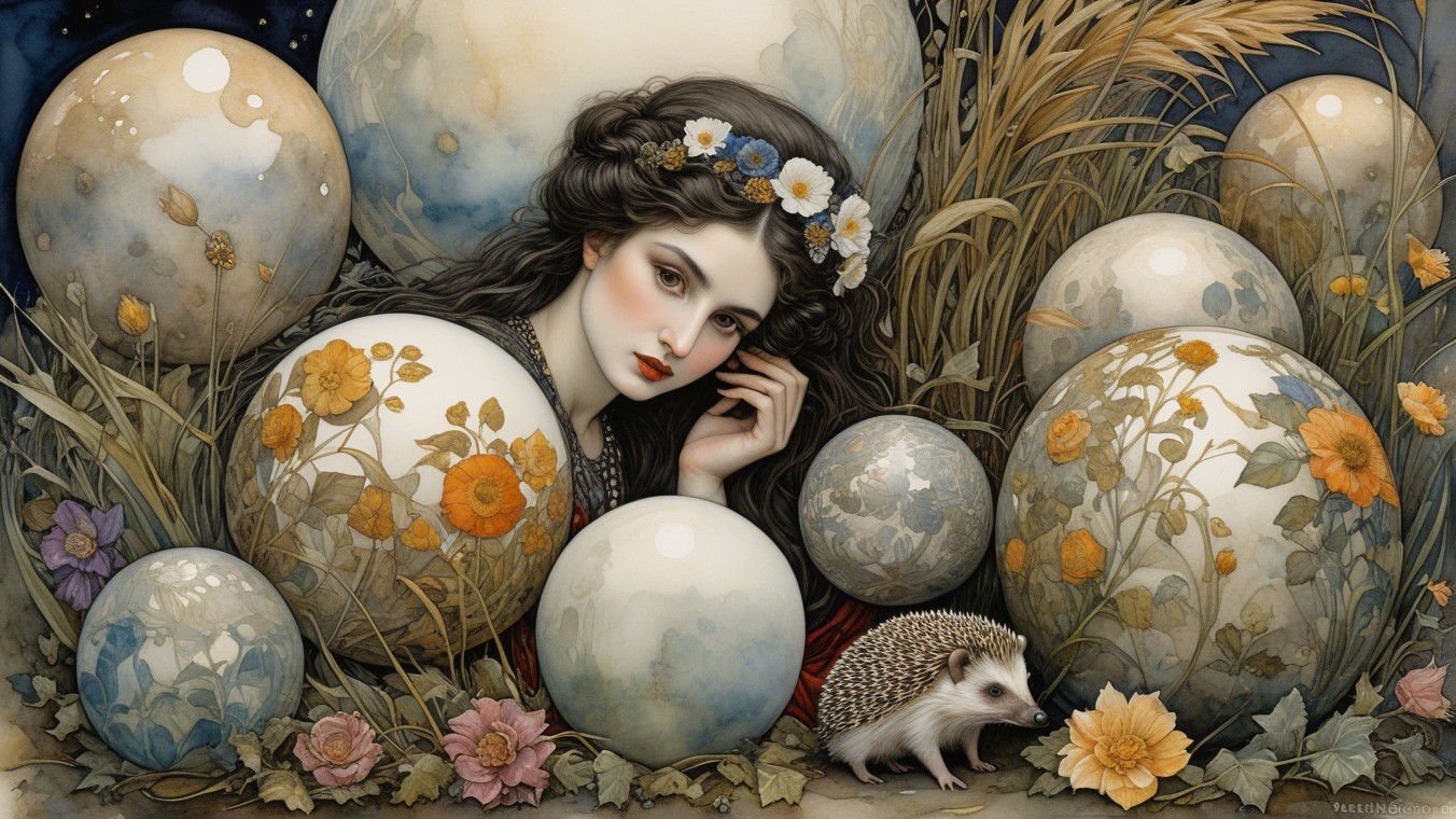 A mystical woman with flowing dark hair rests among ornate, golden-patterned orbs and delicate flowers. A hedgehog curiously approaches, adding a whimsical touch to this enchanting scene.