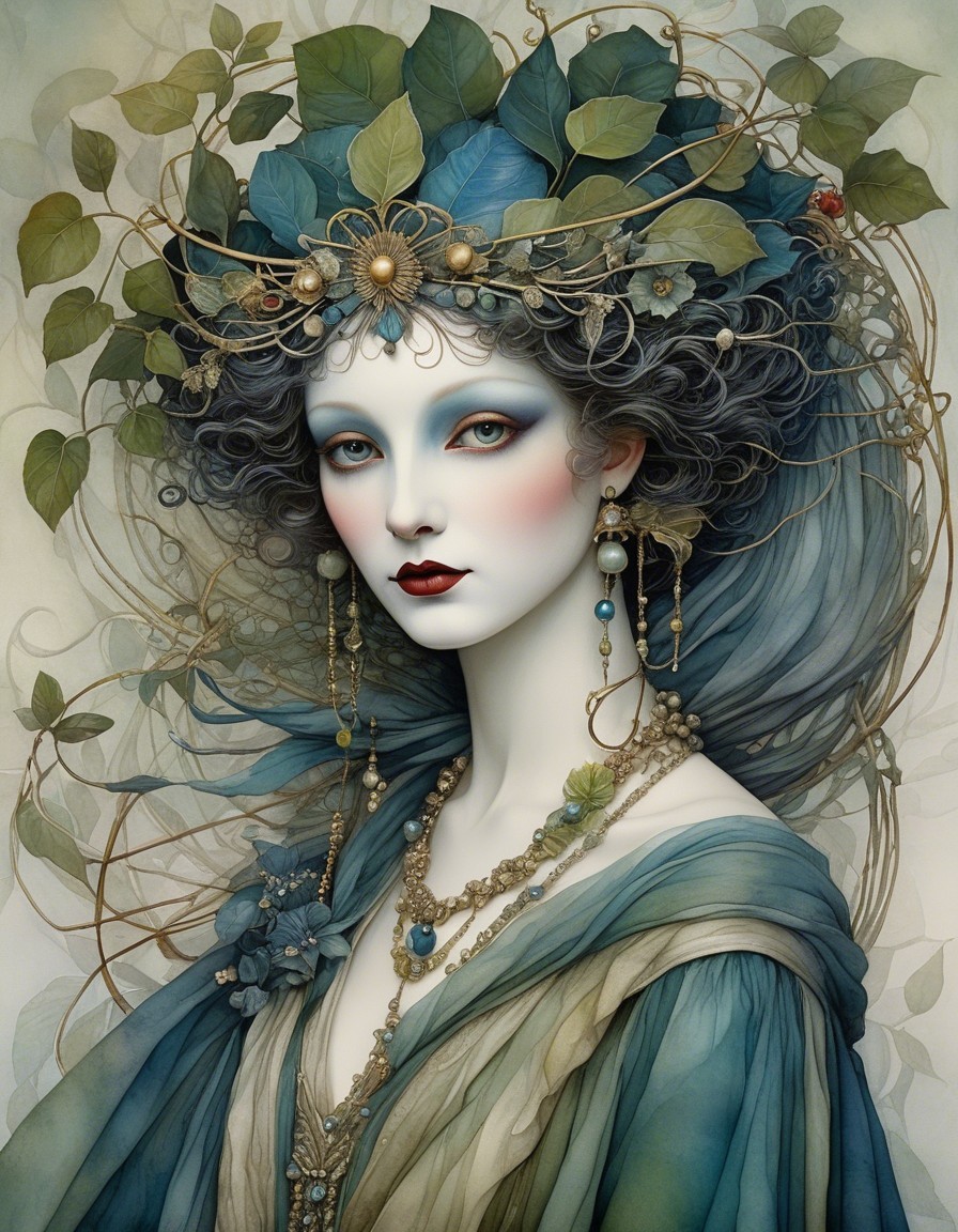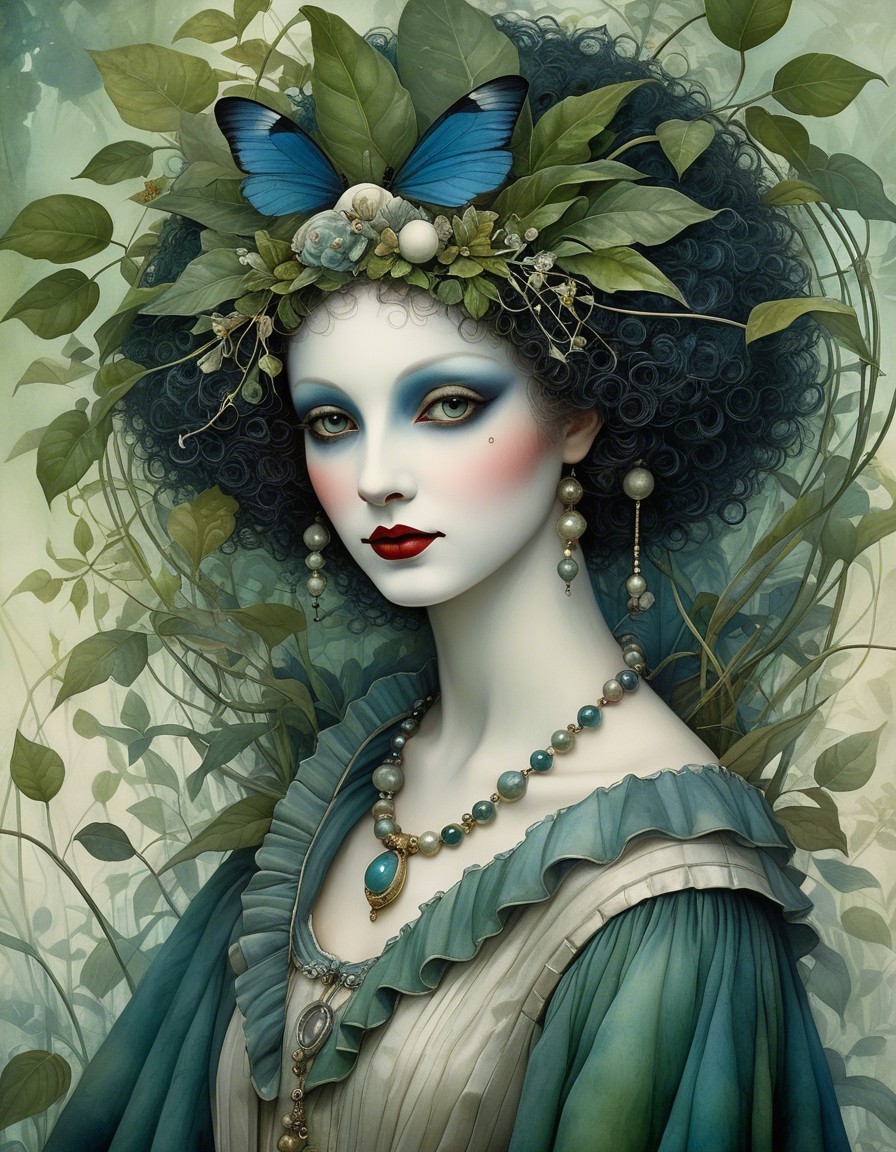 Close up, impish devious beautiful Pierrot creature in a garden jungle maze, in the style of Alexander Jansson. by Catrin Welz-Stein, Michael Parkes