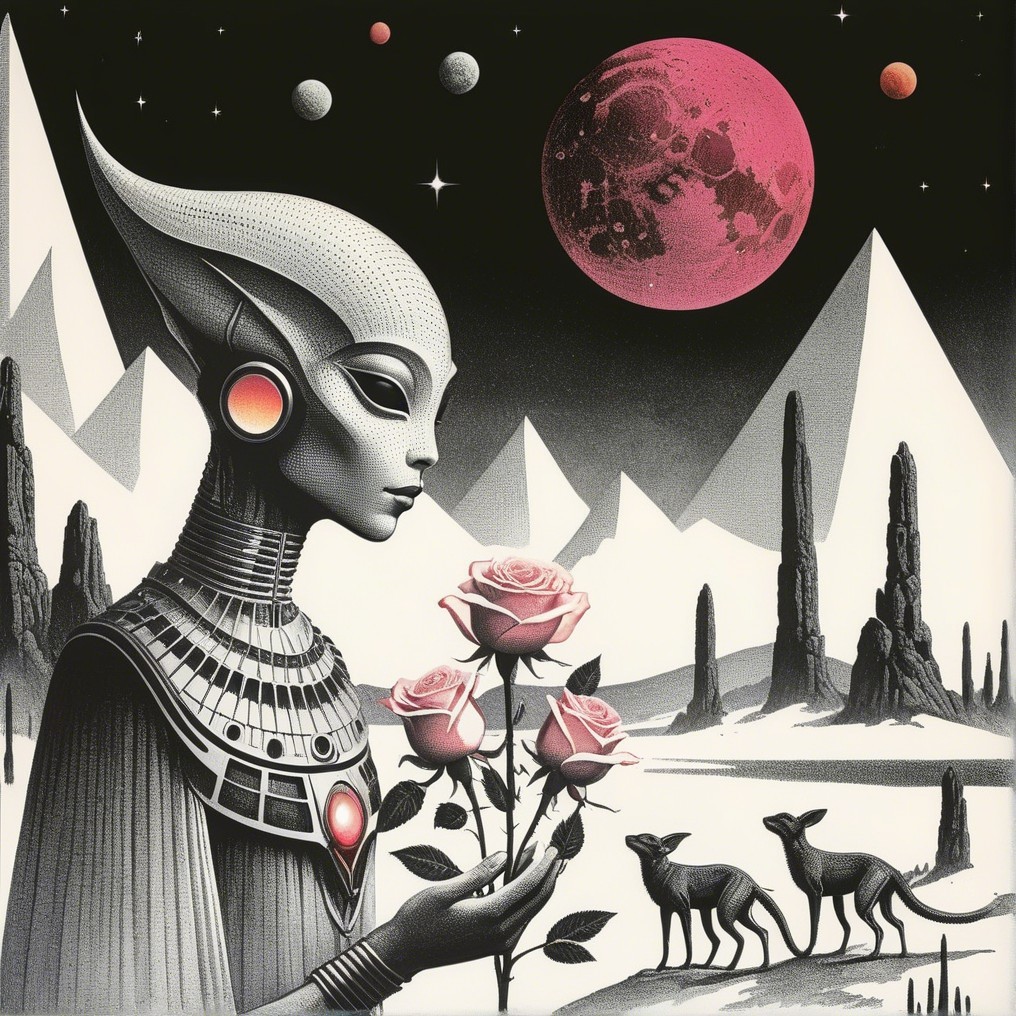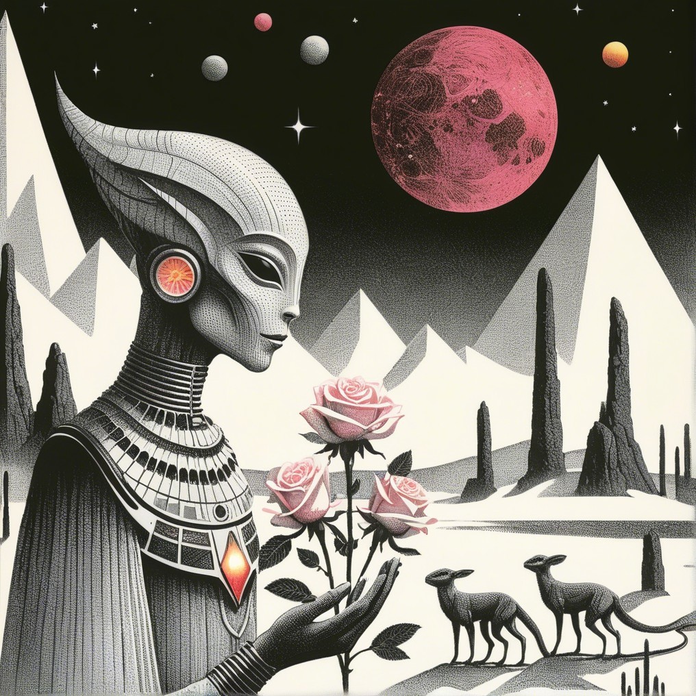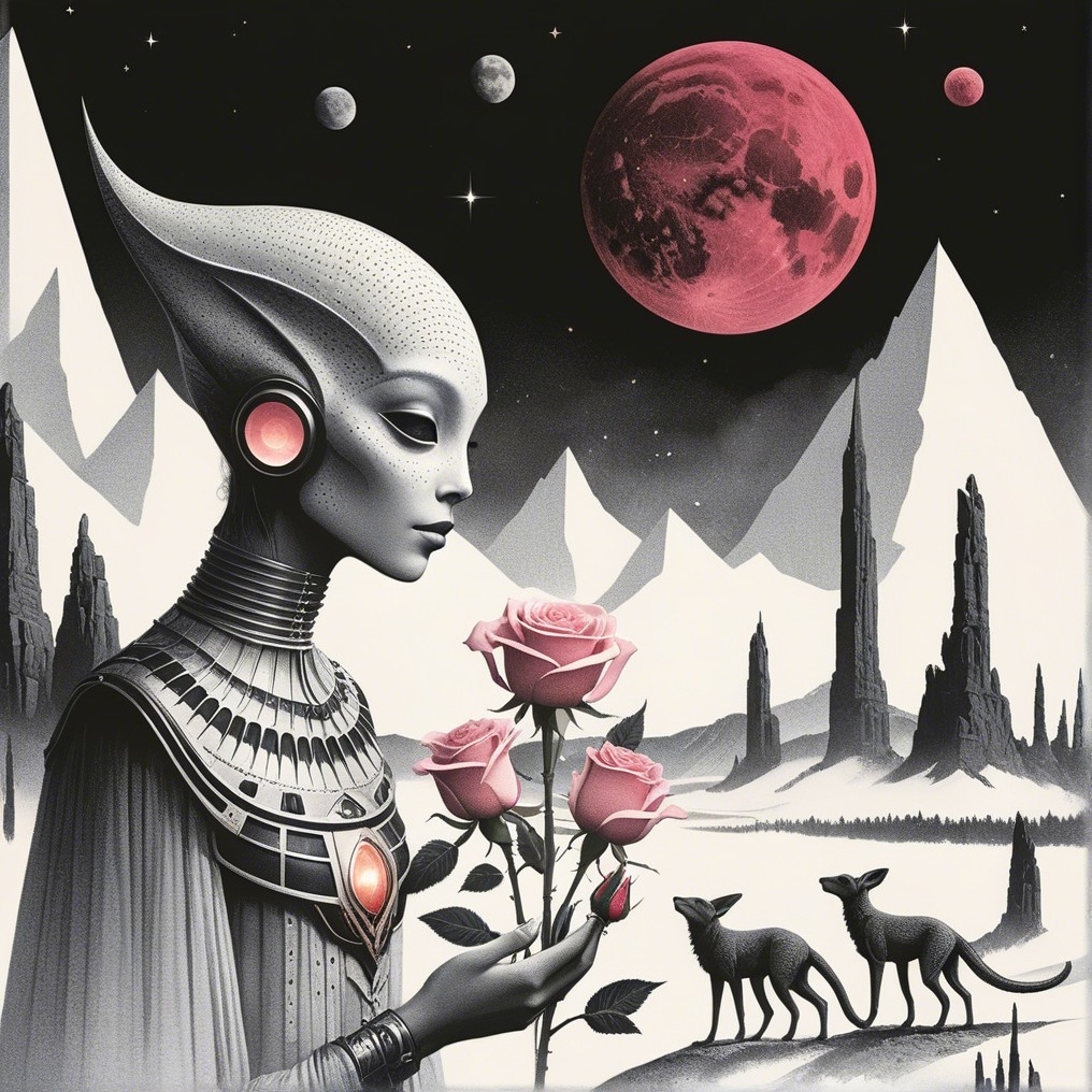 A serene alien being in ceremonial robes tenderly holds pink roses under a red moon. Monumental spires rise from a pale desert, where two fox-like creatures stand in reverence. The night sky is dotted with stars and moons—eternal, sacred, and silent.