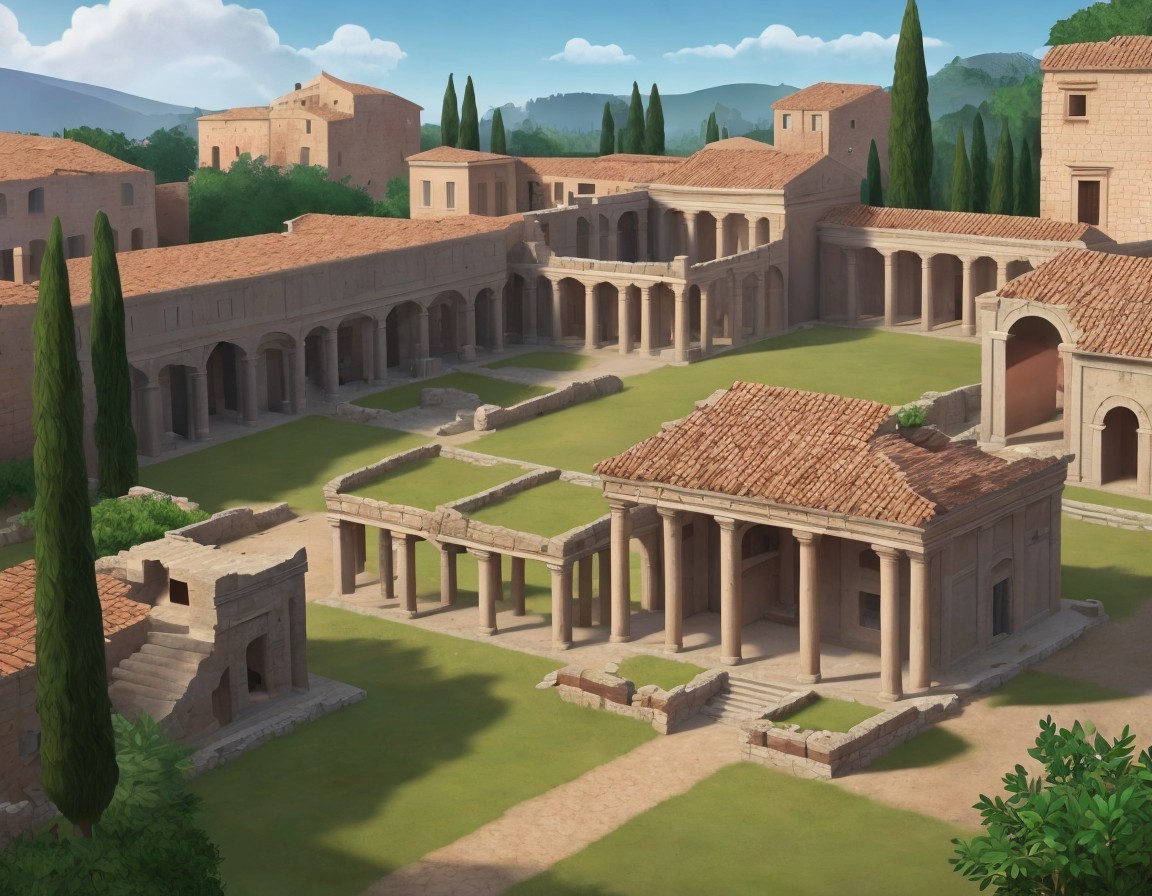 A serene Renaissance painting depicting an idealized classical landscape with buildings, a courtyard, and distant mountains.