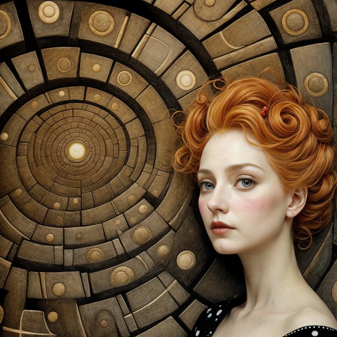 A striking portrait of a woman with vibrant red curls and bold makeup, set against an abstract spiraling background. Her expression is captivating, blending elegance with a sense of intrigue.