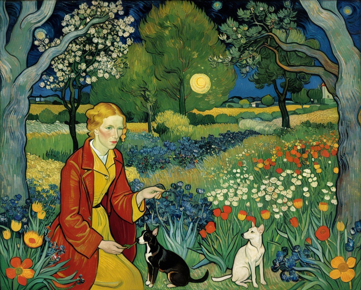 A floral park landscape van Gogh style, where a woman in a red dress, sits beside flowers and cats. A winding path leads through a beautifully detailed garden under a starry sky.