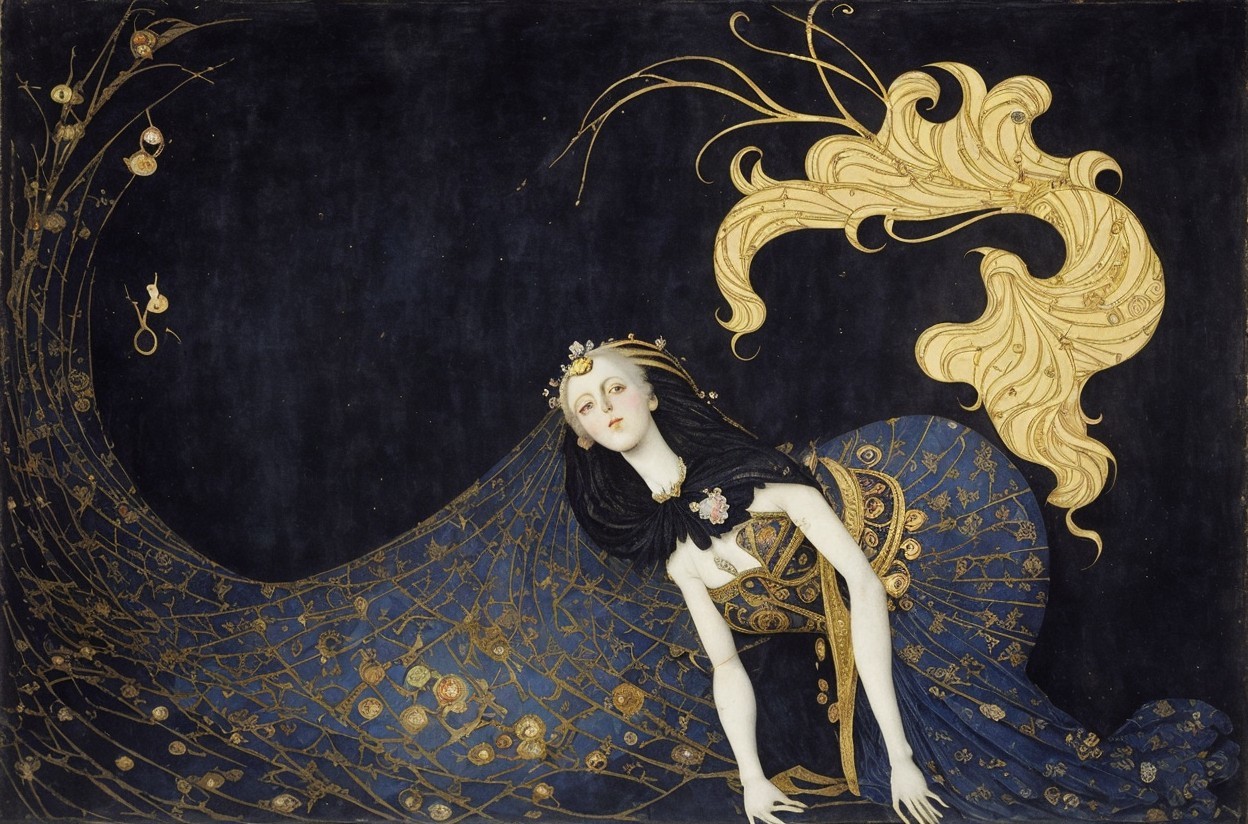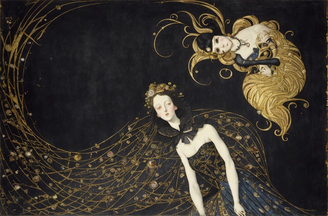 An Art Nouveau illustration featuring two ethereal women with elaborate hair and ornate clothing, surrounded by intricate, swirling golden patterns.