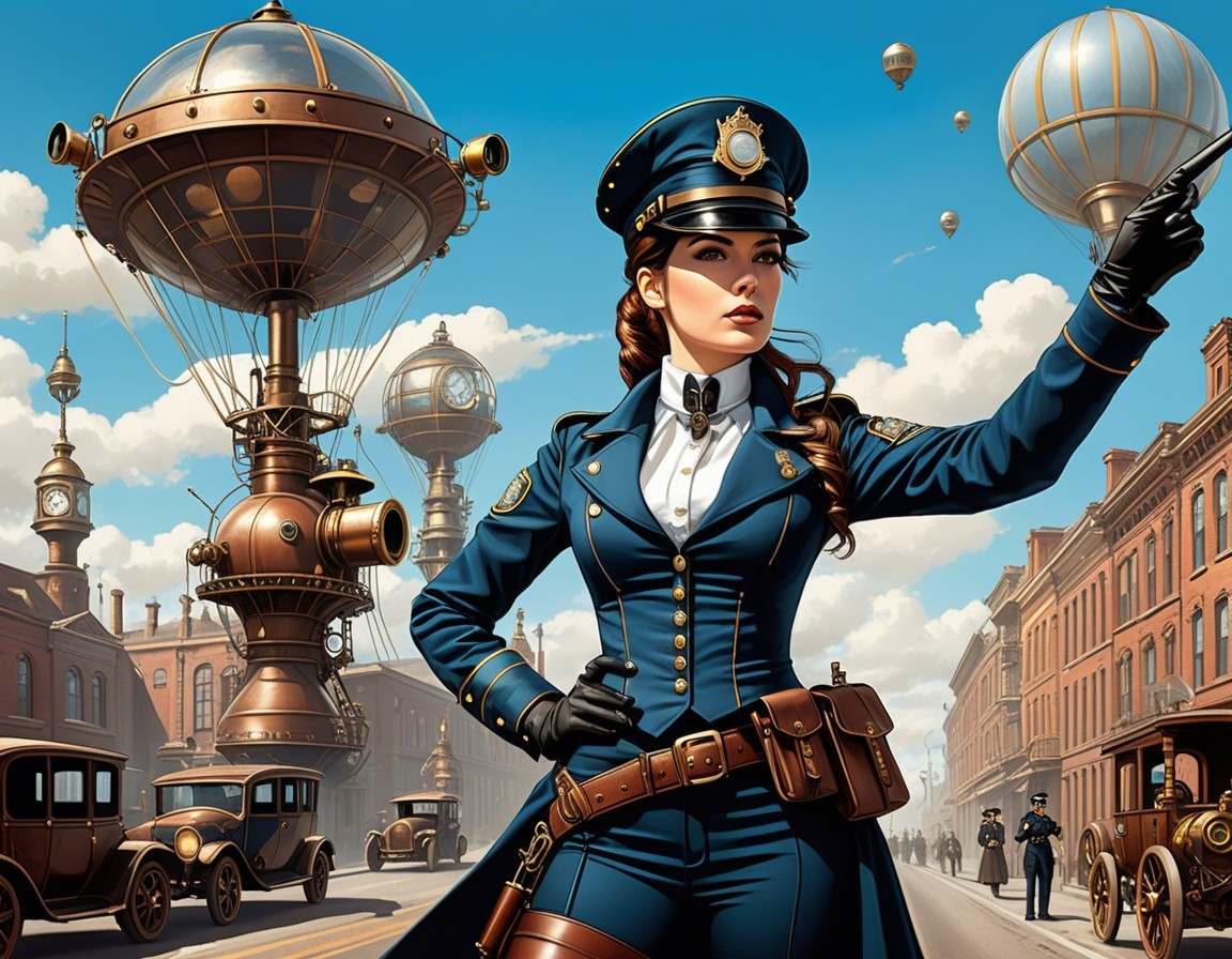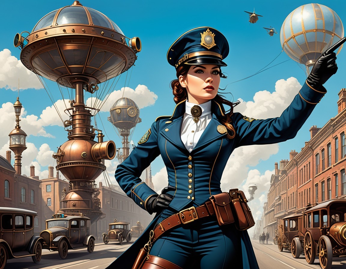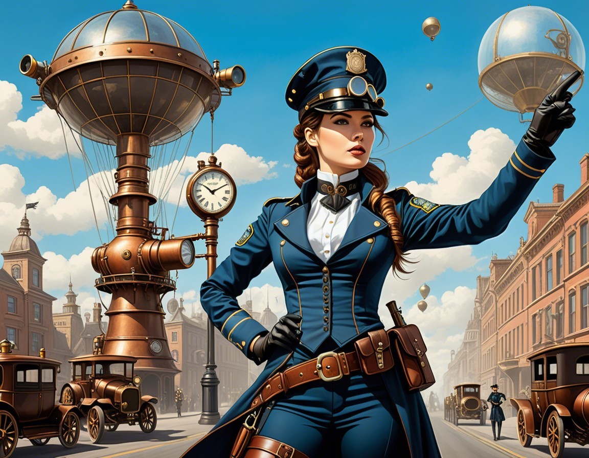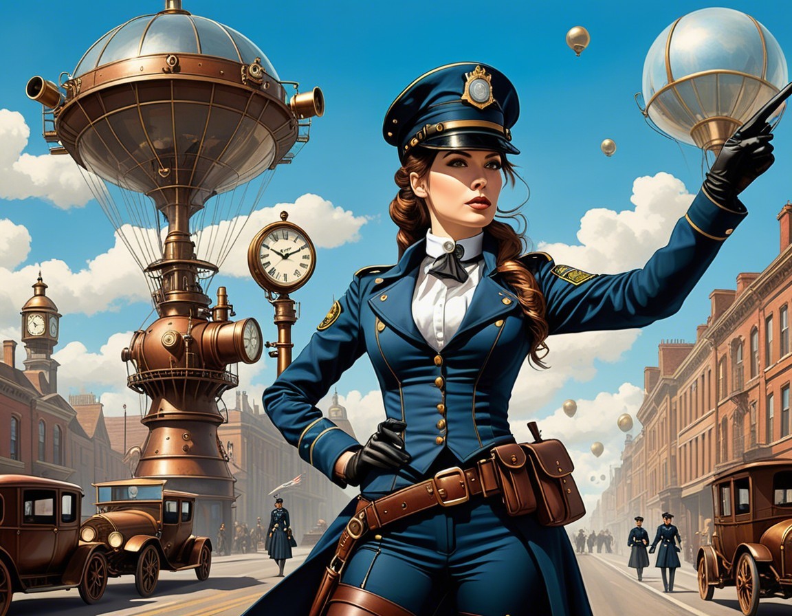 A confident female police officer stands proudly in a steampunk cityscape, featuring vintage vehicles, large clockwork machines, and hot air balloons against a bright blue sky.
