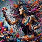 A young woman poses confidently against a vibrant, paint-splattered backdrop. She wears a shimmering, metallic outfit with a playful mix of colors, enhancing the energetic, artistic vibe around her.