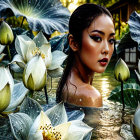A serene scene depicts a young woman partially submerged in a pond surrounded by lush green lily pads and blooming white lotus flowers, radiating a sense of tranquility and natural beauty.