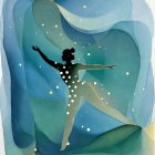 A silhouette of a dancer gracefully poses against a backdrop of flowing blue and green shapes, conveying a sense of movement and freedom in a harmonious blend of colors.