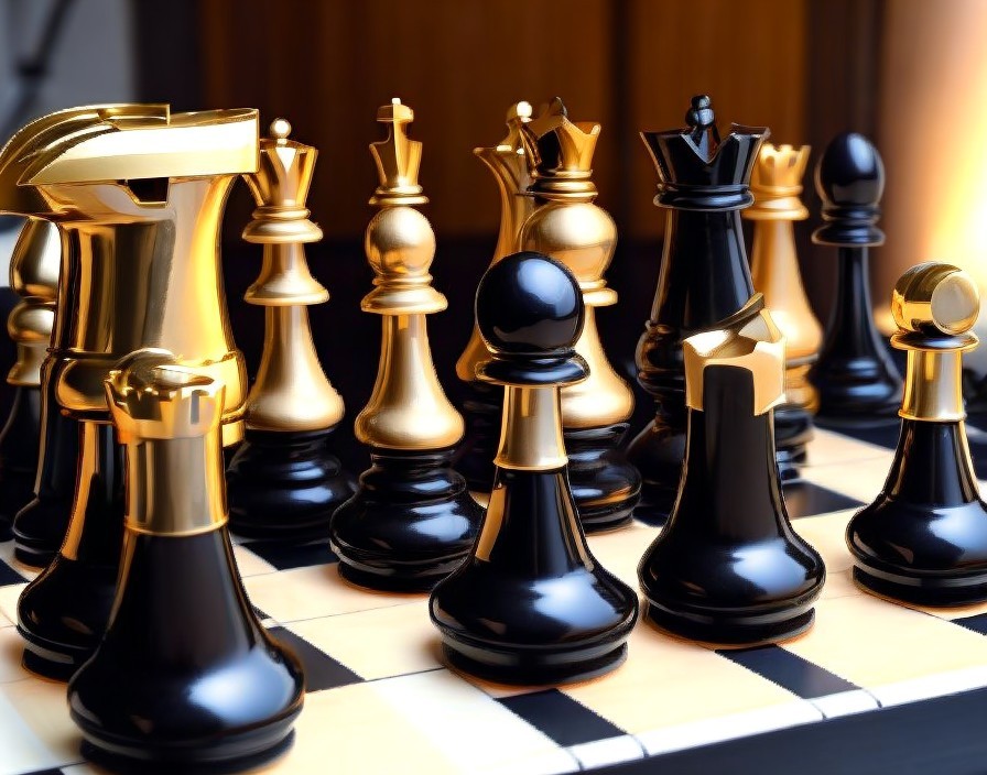 A chess board on which chess pieces are placed, but at the top they are supposed to have the heads of famous German politicians.