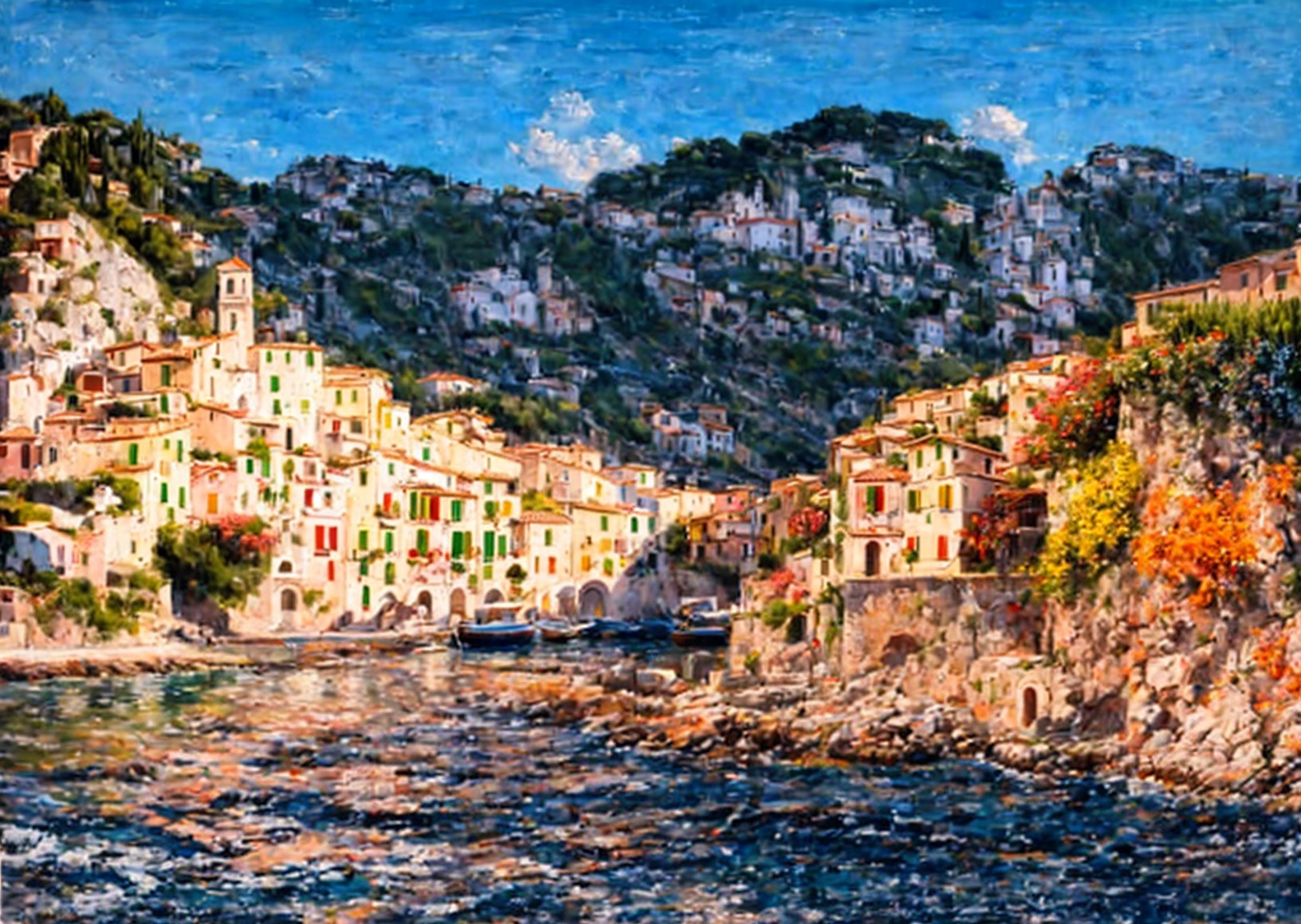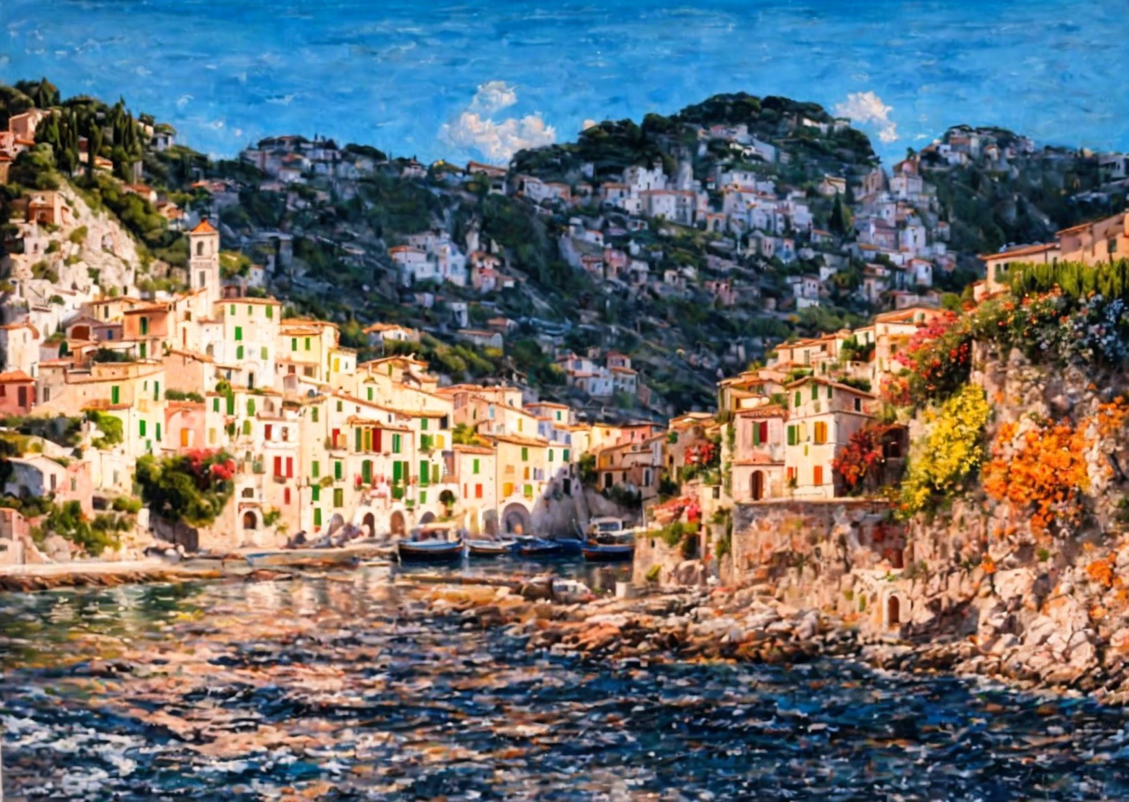 A picturesque coastal village with terraced houses, colorful facades, and lush greenery, overlooking a calm sea.
