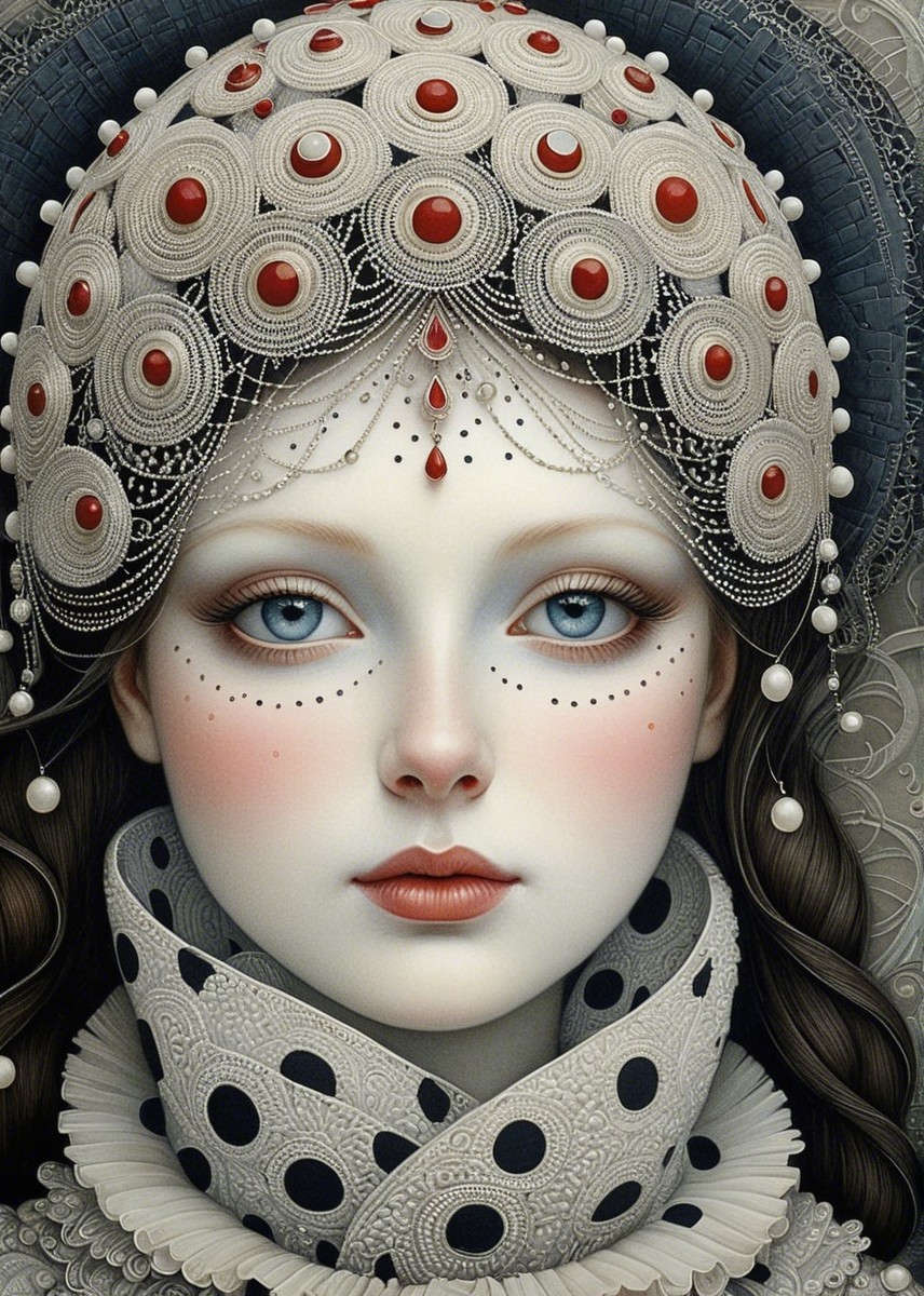 The image features a serene young woman with striking blue eyes and intricate decorative elements in her hair, including pearls and gemstones, all framed by a delicate floral collar.