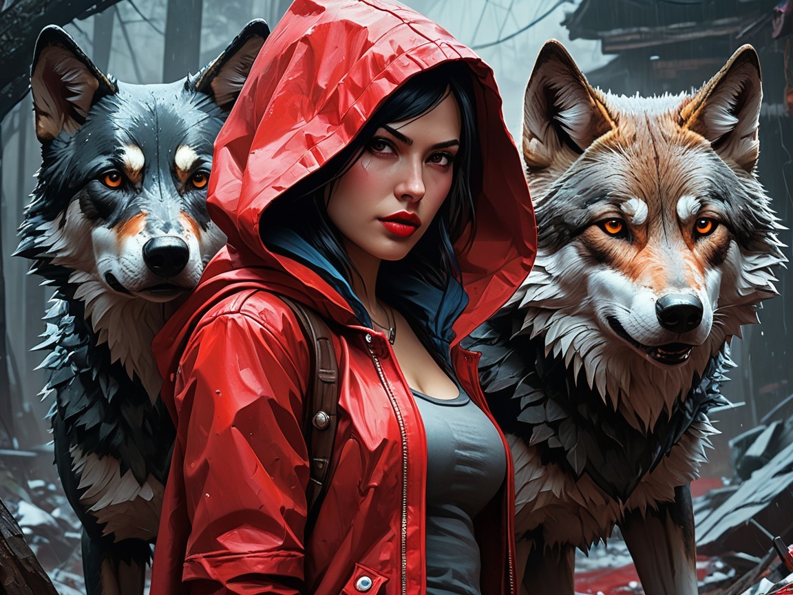 A woman in a striking red hooded jacket stands between two stylized wolves, creating a dramatic and mystical atmosphere in a dense, shadowy forest.